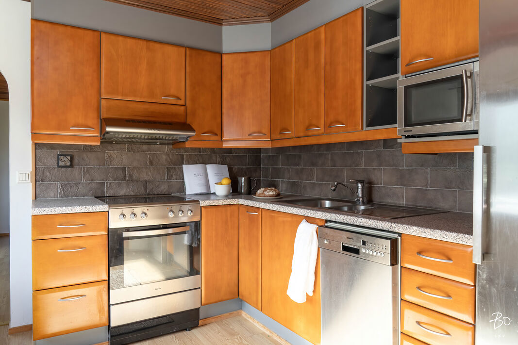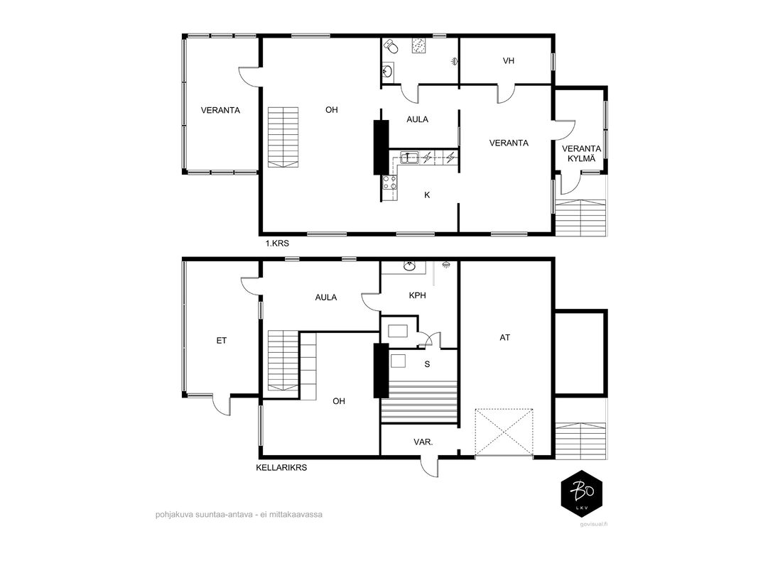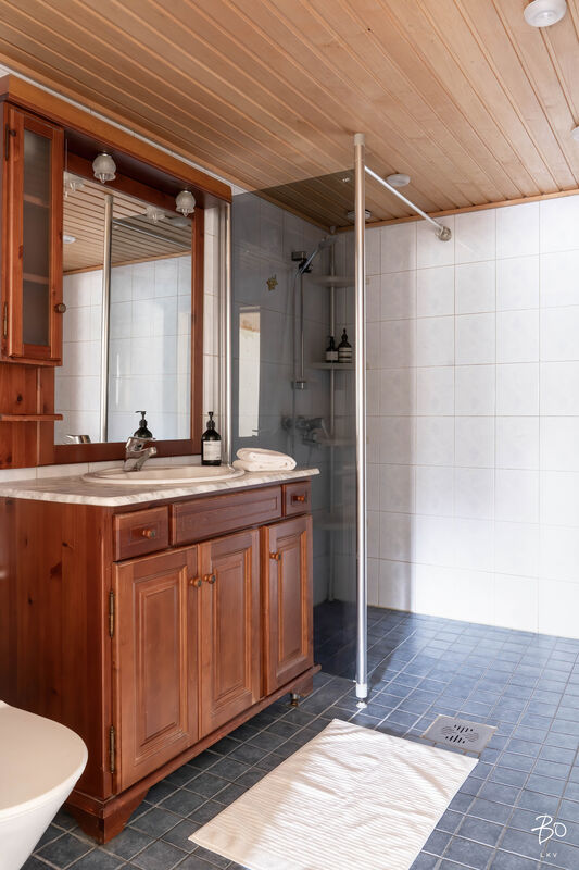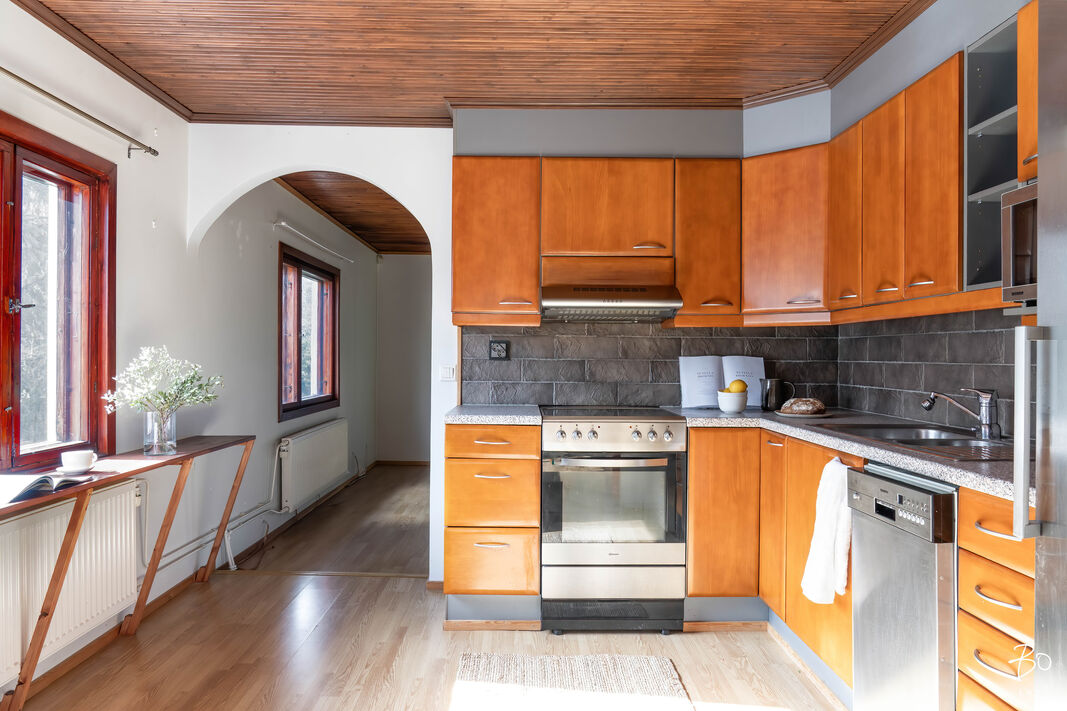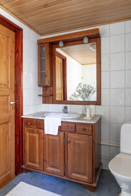Talon yläkerrassa on avarat huoneet ja kellarissa tilava aulatila, kylpyhuone ja puulämmitteinen sauna. Kellarissa on myös tilava autotalli.