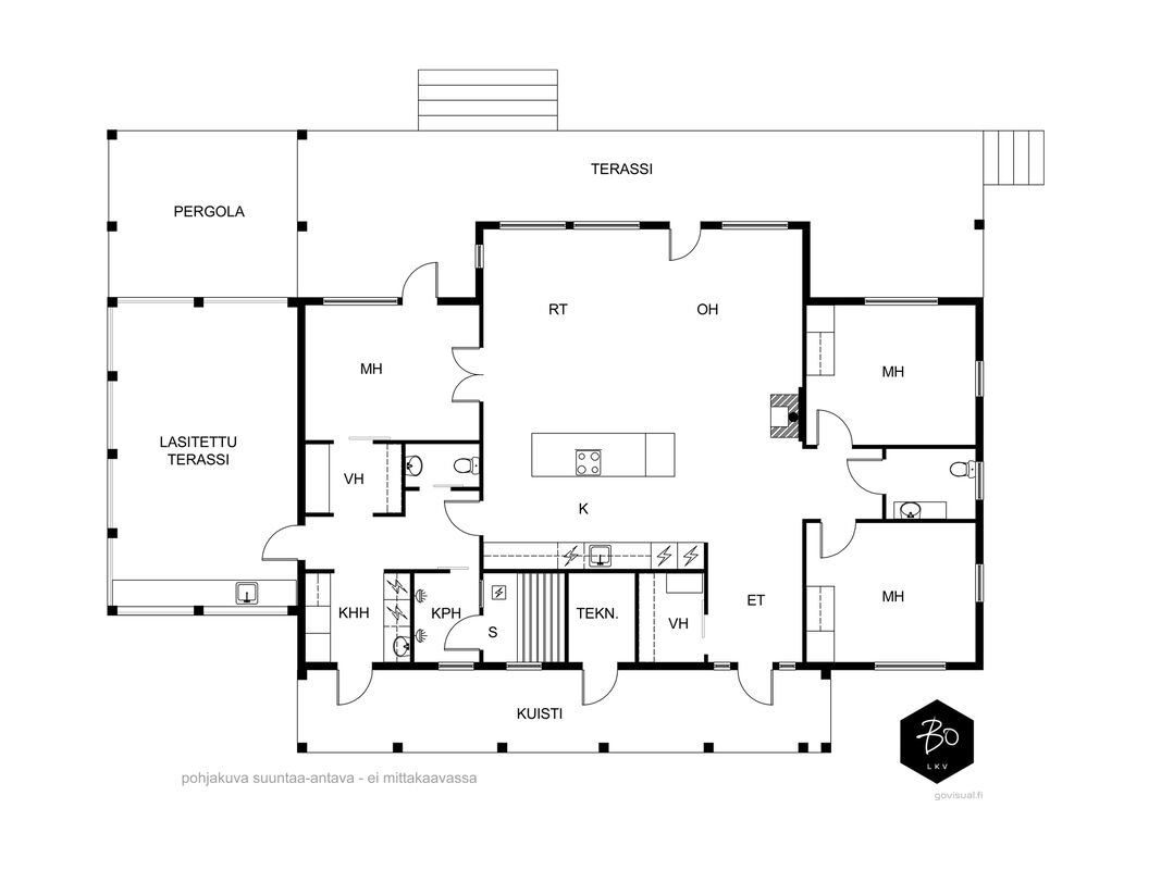 Varustus: pesukone, pesukoneliitäntä, kuivausrumpu, pesuallas, lattialämmitys, kurapiste