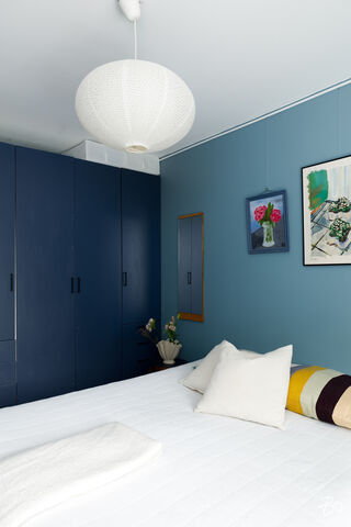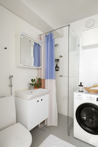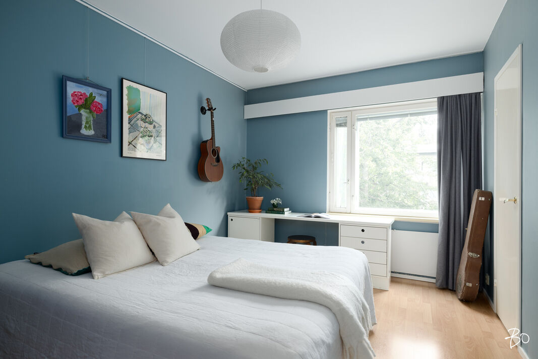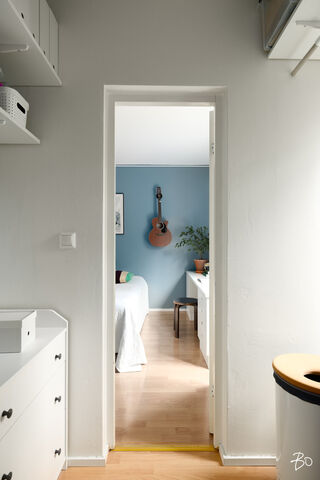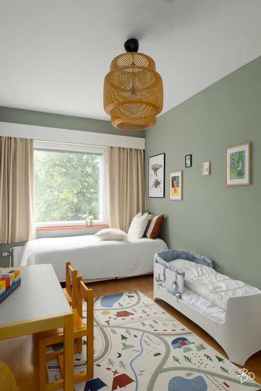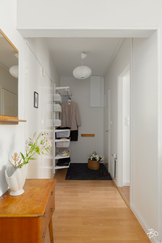 Kaksi hyvänkokoista makuuhuonetta sijoittuvat käytännöllisesti vaatehuoneen molemmin puolin, ja säilytystilaa löytyy myös kaapistoista. Siisti kylpyhuone on neliöihin nähden toimiva.