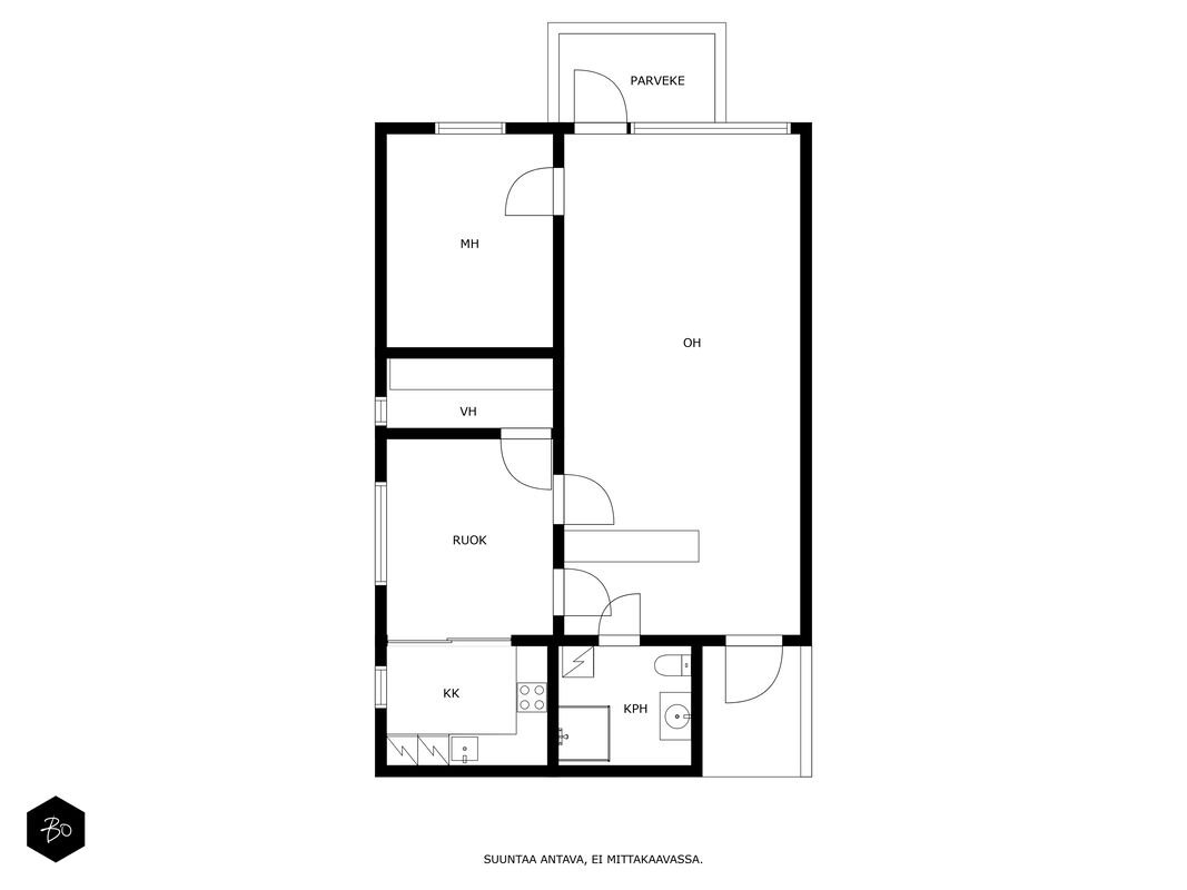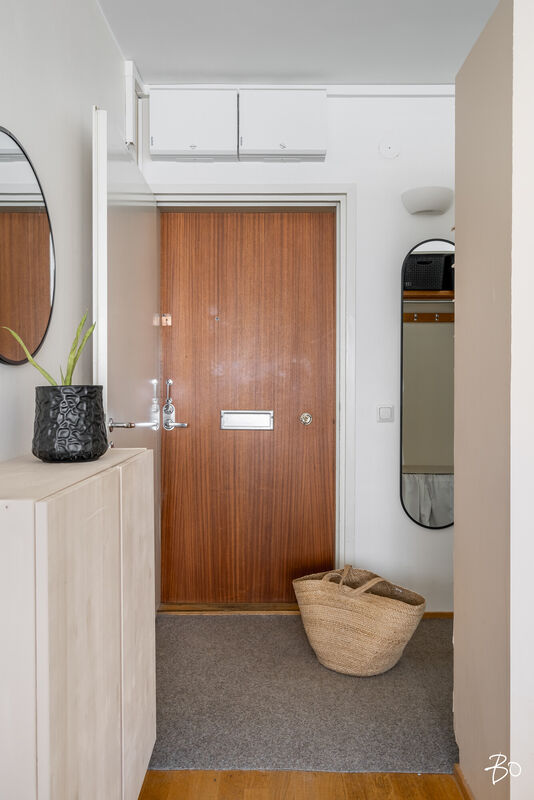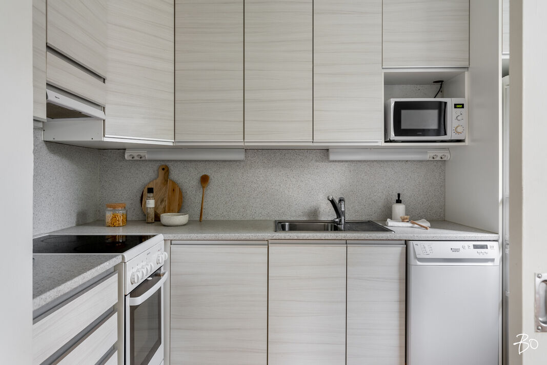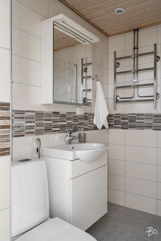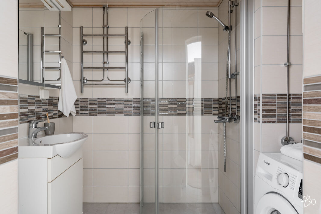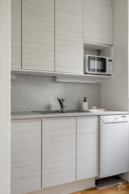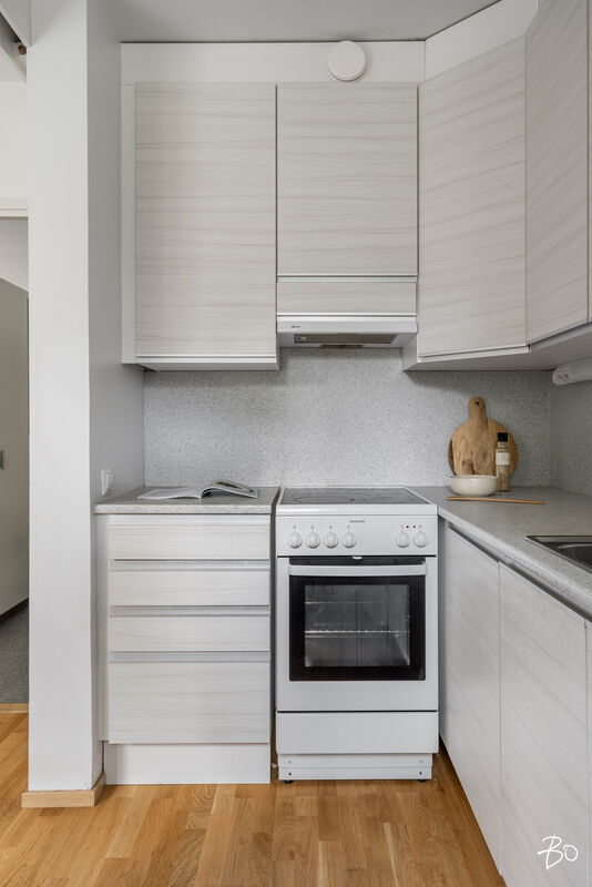 Keittiössä on vaaleat, raikkaat kaapistot sekä sopivasti säilytystilaa, joten kokkailu ja arjen askareet sujuvat vaivatta. Asunnon kylpyhuone on käytännöllinen ja harmoninen kokonaisuus, josta löytyy kaikki tarvittava, kuten pyykinpesukoneelle varattu tila, pyyhekuivain sekä tilaa säästävät kääntyvät suihkuovet.