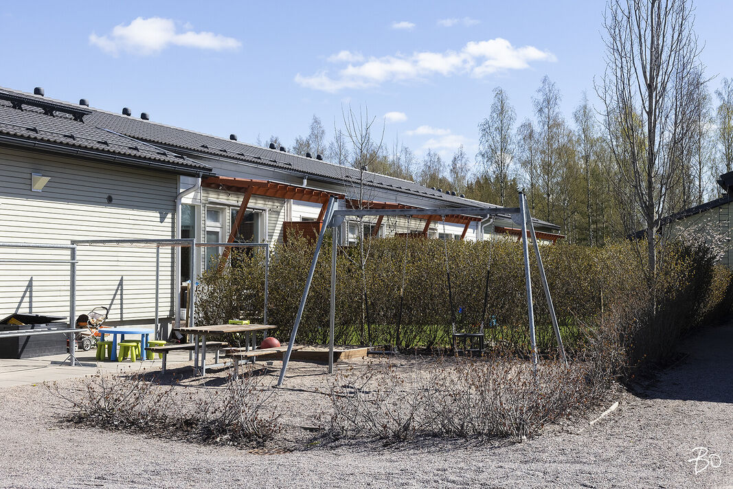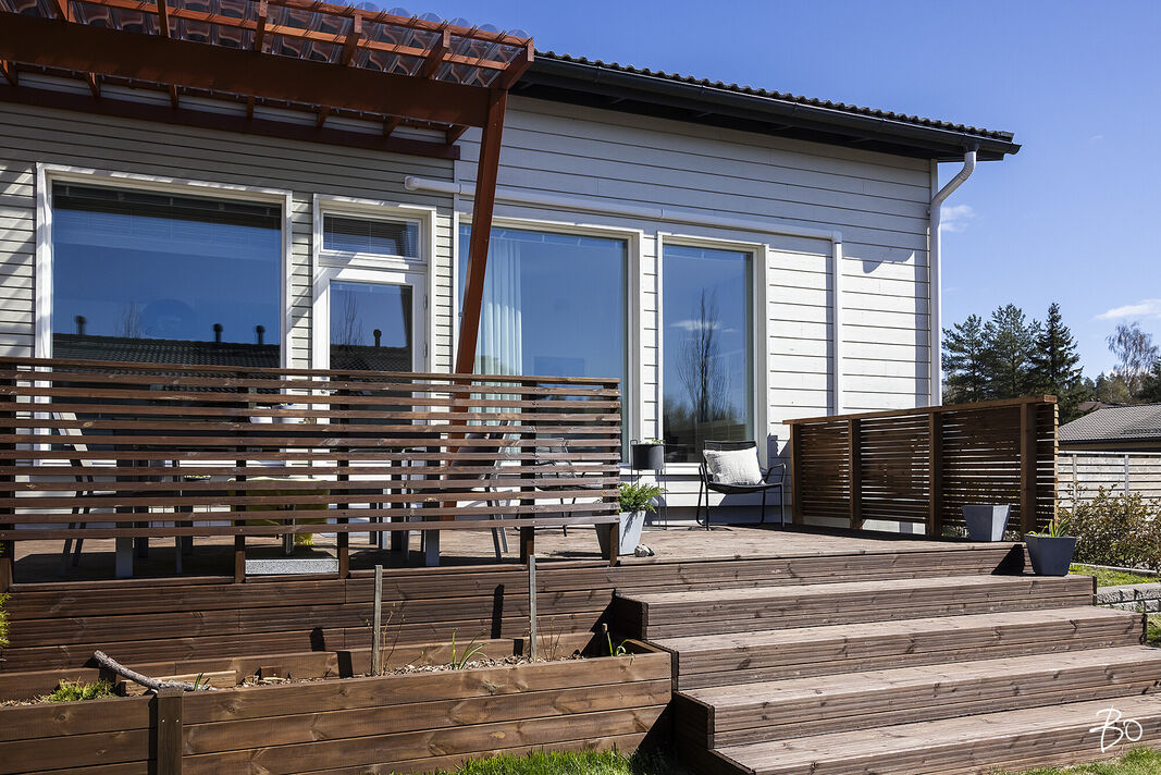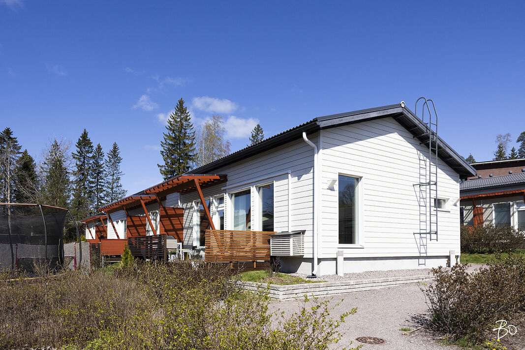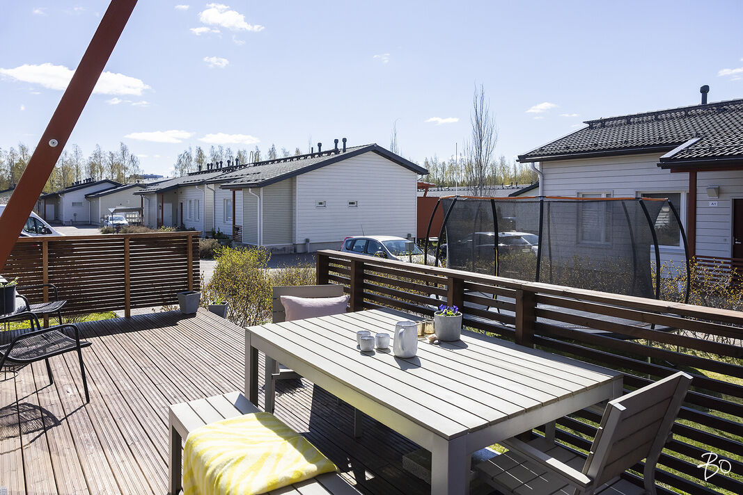 Rivitalokokonaisuus sijaitsee omalla tontilla. Isolla terassilla on katettu pergola, jossa voi nauttia kesäpäivist. Rauhallinen ympäristö tekee kotiin palaamisesta aina miellyttävää, ja lasten leikit sujuvat turvallisesti omalla pihalla.