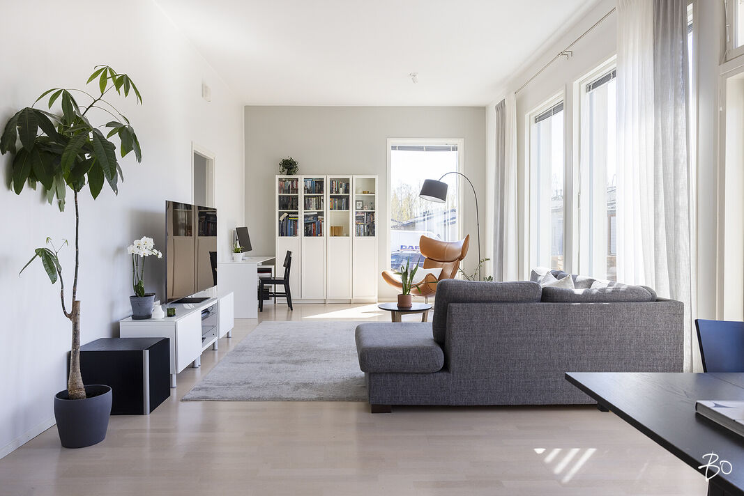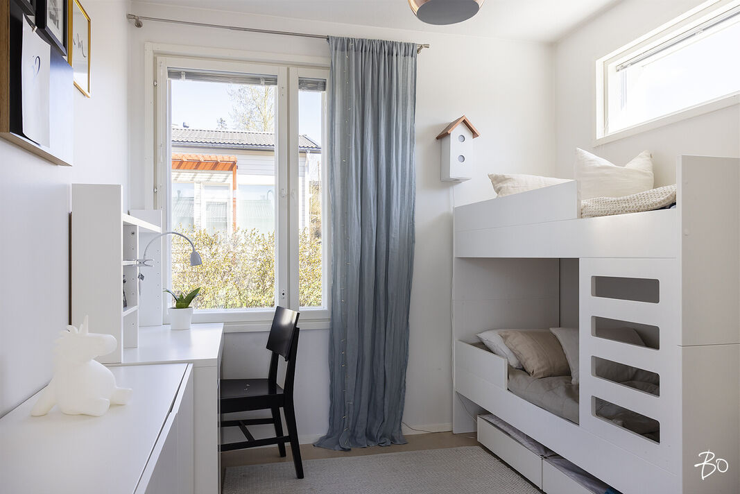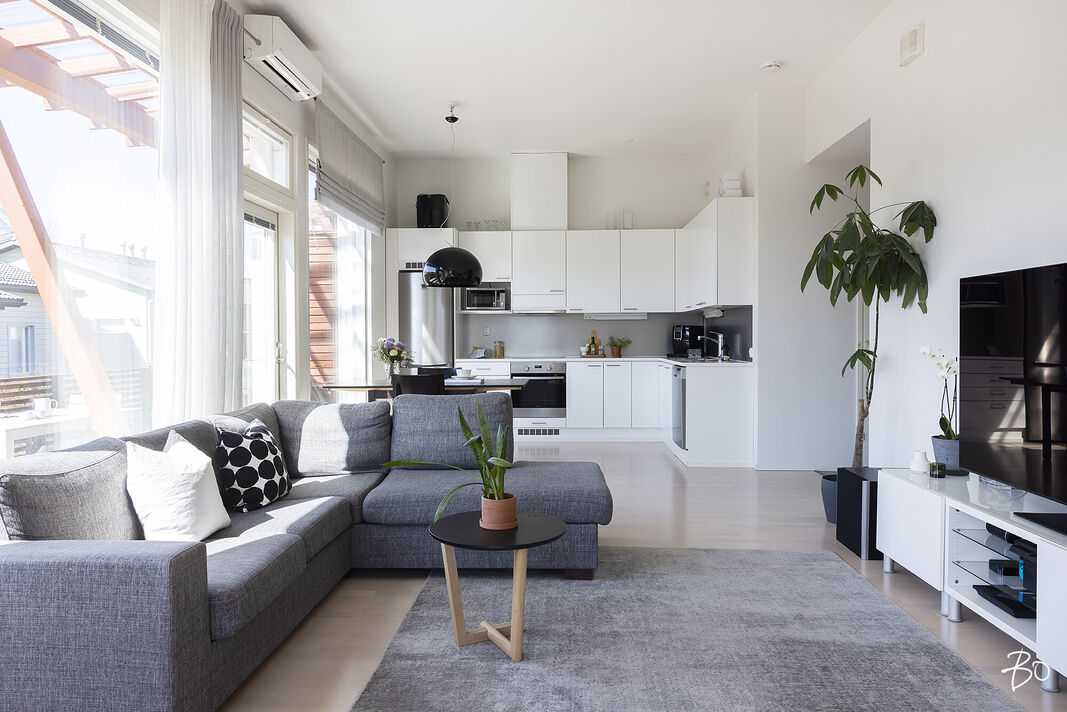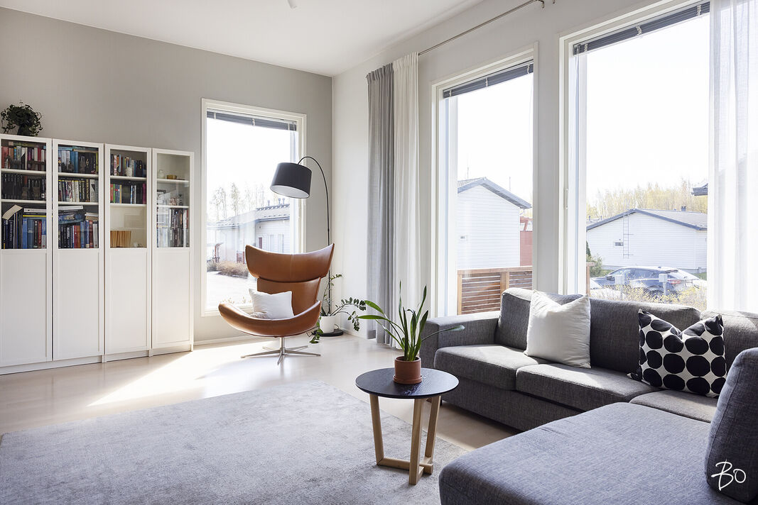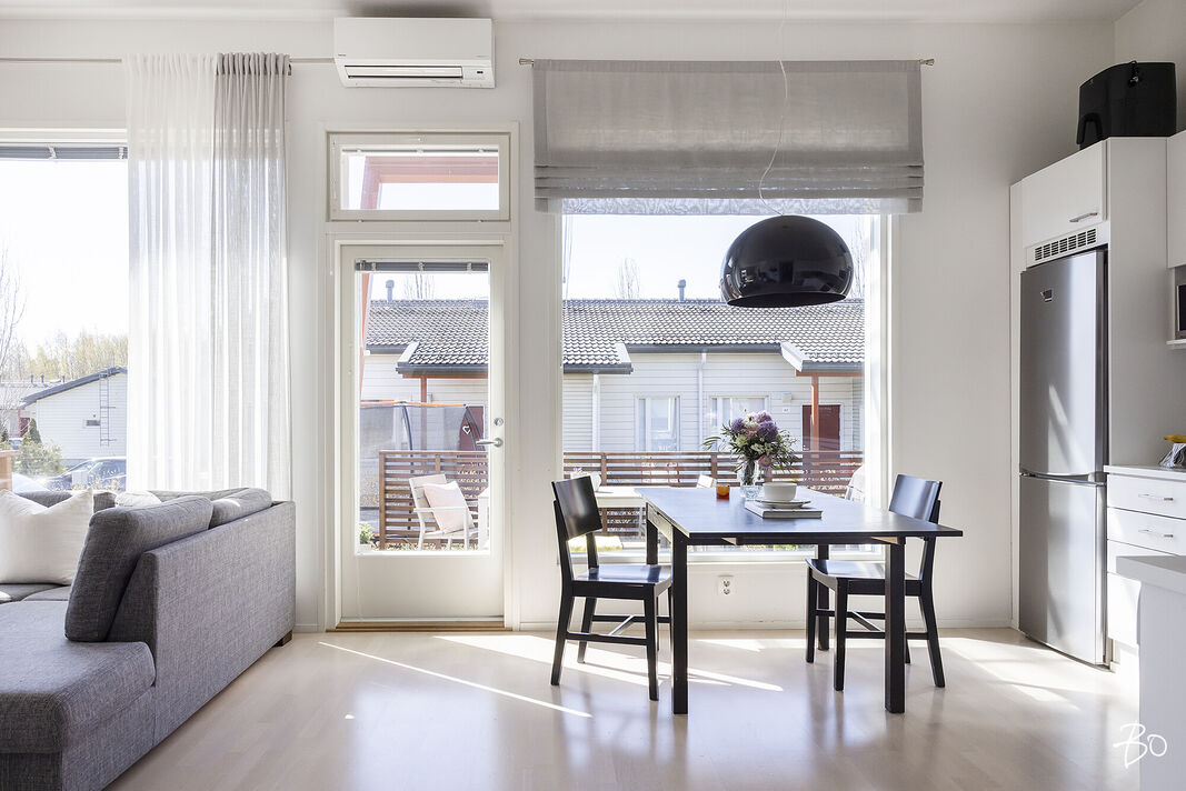 Tämä vuonna 2015 käyttöönotettu yhden tason koti tarjoaa valoa ja avaruutta korkeiden huoneidensa ansiosta. Avarassa olohuoneessa ihastuttavat suuret ikkunat, jotka päästävät luonnonvalon tulvimaan sisään, luoden kodikkaan ja rauhallisen ilmapiirin. Lämmintä ja harmonista sisustustyyliä korostavat harkitusti valitut sävyt, jotka luovat kodista miellyttävän ja kutsuvan. Makuuhuoneet ja tupakeittiö on suunniteltu palvelemaan niin arkea kuin juhlaa, ja oma sauna tuo rentouttavan lisän asumiseen. Myös asunnon jäähdytys kesähelteillä on otettu huomioon.