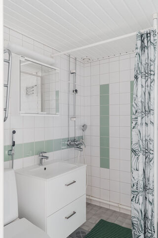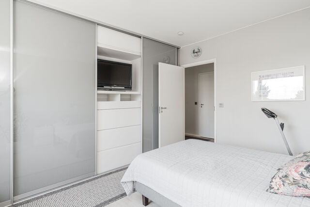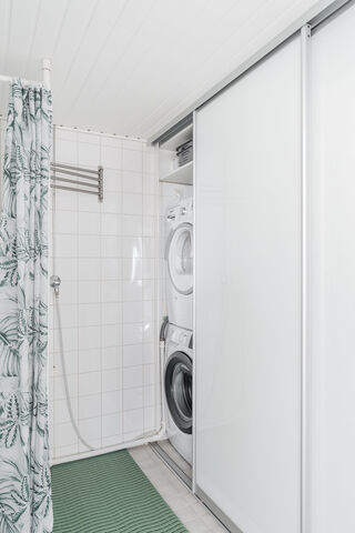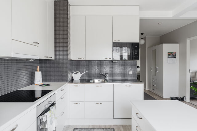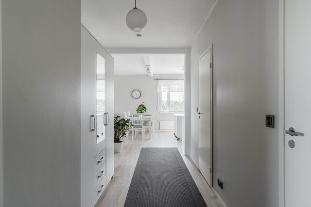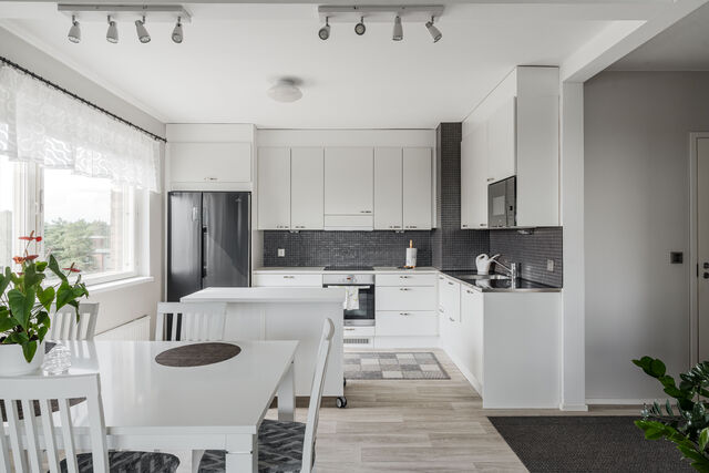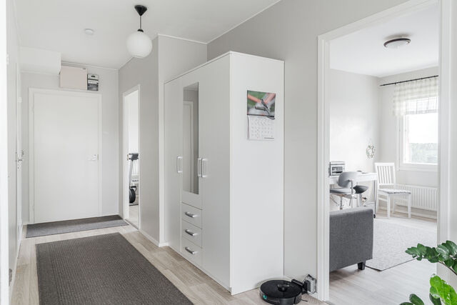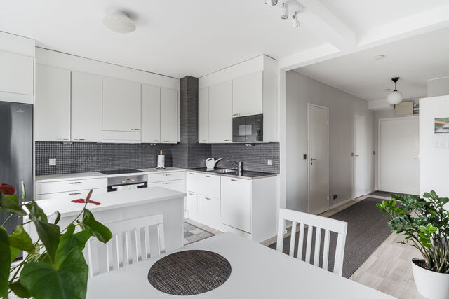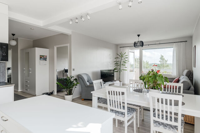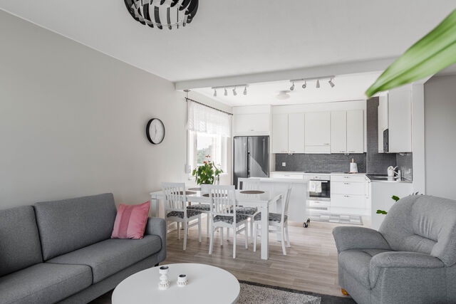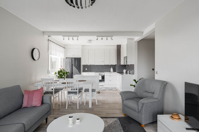 Tästä avarasta ja valoisasta kodista löytyy toimivat ja kauniit sisätilat, joissa on panostettu vaaleisiin sisustussävyihin. Olohuoneen ja keittiön välinen seinä on kaadettu, mikä luo tilan tuntua ja mahdollistaa rennon oleskelualueen, jossa on mahdollista viettää aikaa perheen tai ystävien kanssa. Makuuhuoneita tässä kodissa on kaksi. Lisäksi tilava kylpyhuone ja erillinen vaatehuone, jossa hyvin säilytystilaa.