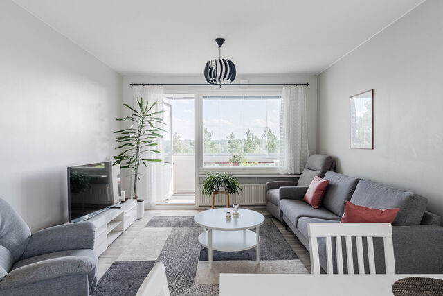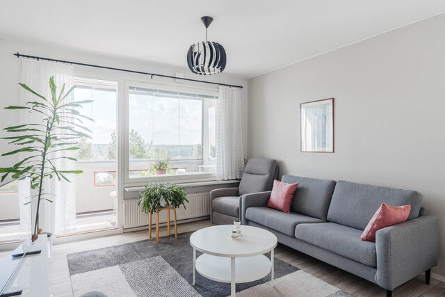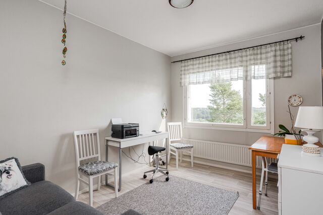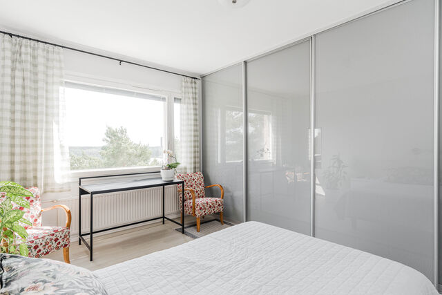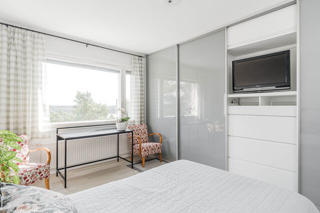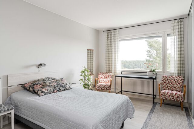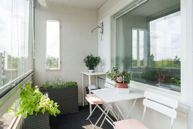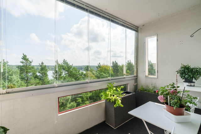 Upea ylimmän kerroksen asunto Jalavatie 13:ssa, jonka lasitetulta parvekkeelta avautuu kaunis näkymä Käätyjärvelle.