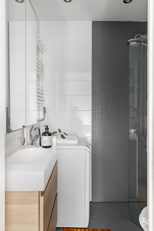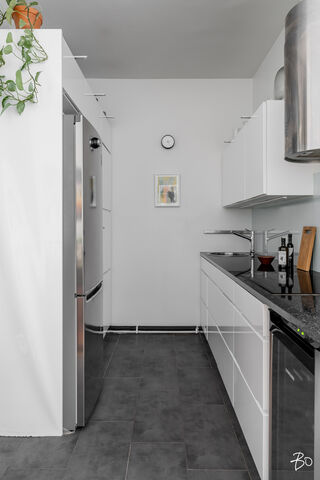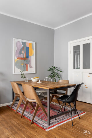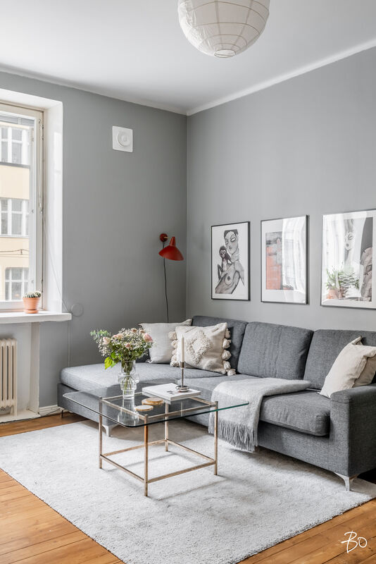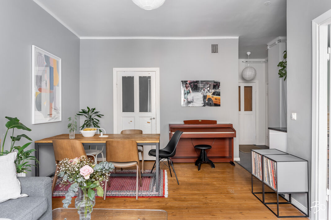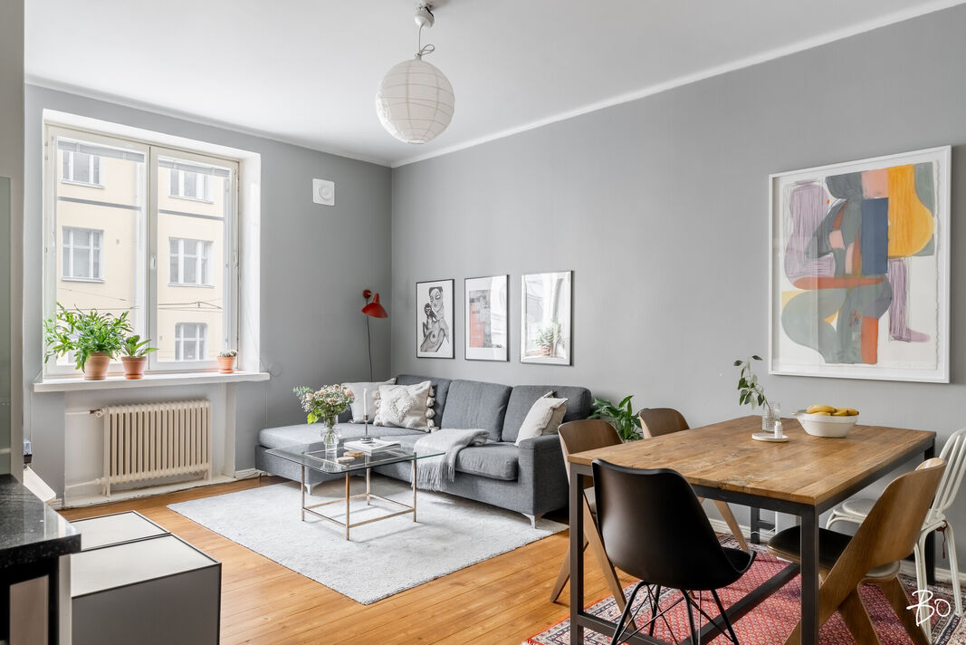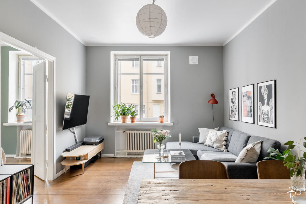 Harmoniset pintasävyt, klassinen puulattia ja suuret ikkunat luovat tyylikkään kokonaisuuden, jossa moderni ilme yhdistyy ajattomaan eleganssiin. Runsas luonnonvalo korostaa tilojen avaruutta ja tuo kotiin lämpimän tunnelman.