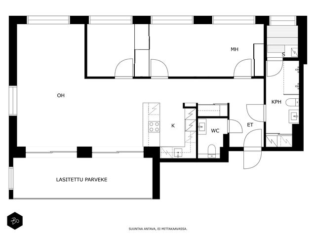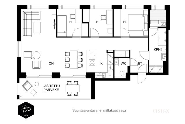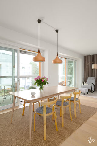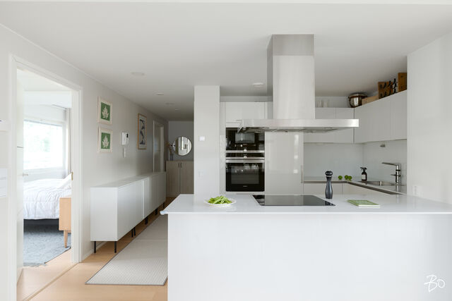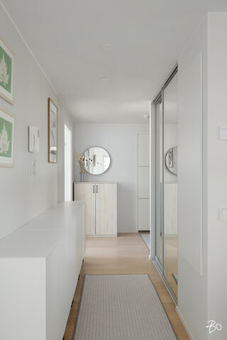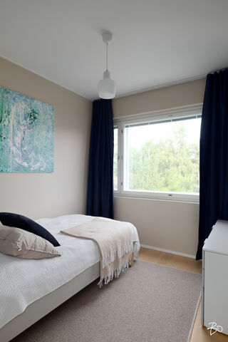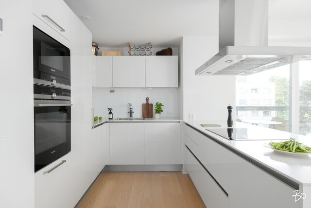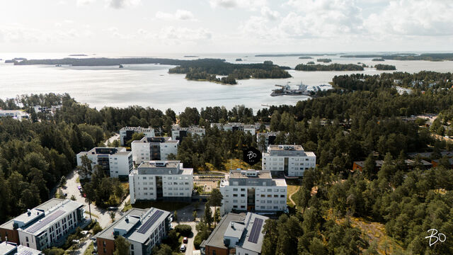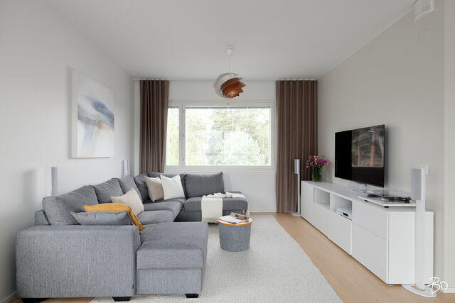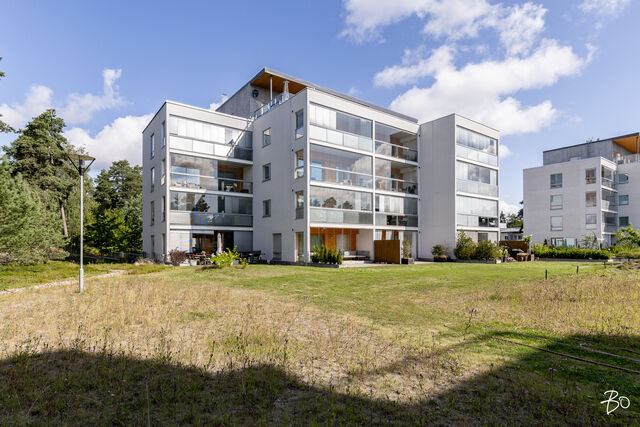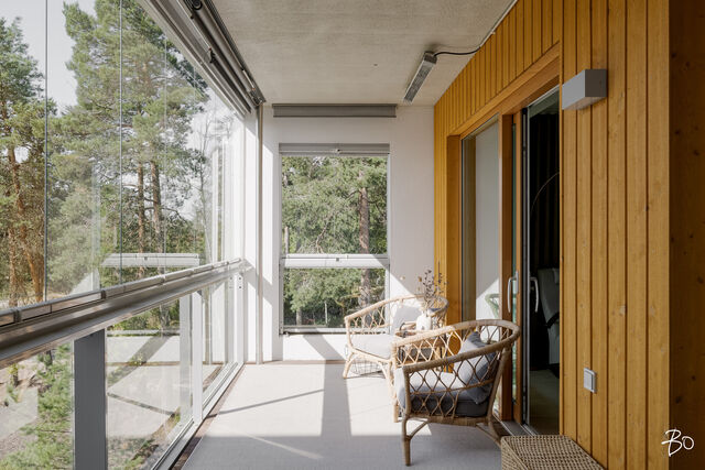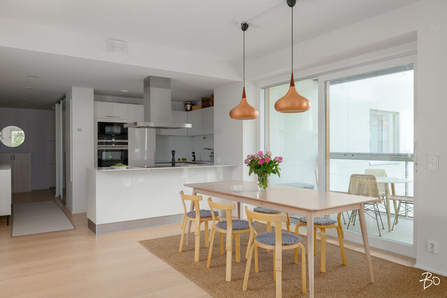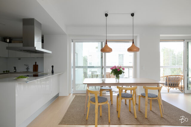 Valo, tila ja huolella valitut materiaalit tekevät tästä kodista paikan, jossa arki kulkee pehmeästi ja juhla saa ansaitsemansa puitteet. Vuonna 2016 valmistuneen yhtiön kolmannessa kerroksessa sijaitseva 100 m²:n huoneisto on avara ja valoisa - olohuoneen ja ruokailutilan yhdistelmä luo väljyyttä ja suuret ikkunat päästävät luonnonvalon kulkemaan läpi kodin vuodenajan sävyissä. Lasitettu parveke jatkaa oleskelutiloja ulos ja tarjoaa paikan rauhallisille kahvihetkille ja rentoon yhdessäoloon aikaisesta keväästä myöhäiseen syksyyn.