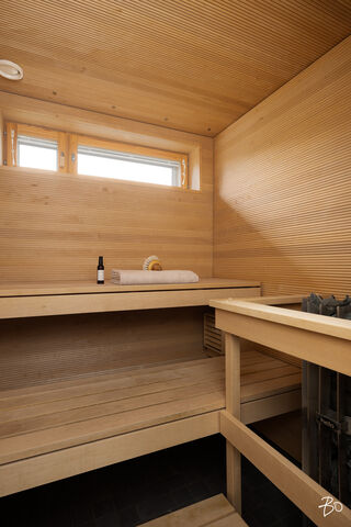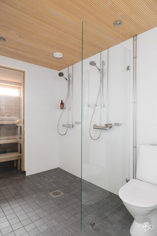 Keittiö on selkeälinjainen ja käytännöllinen - laadukkaat ja käytännölliset kivitasot, integroidut kodinkoneet ja induktioliesi tekevät ruoanlaitosta nautinnon. Tilaa on niin perheelle, vieraille kuin kotitoimistollekin. Asunnon voi tarvittaessa muuttaa neljän makuuhuoneen asunnoksi kuten oheinen kuva havainnoillistaa. Kylpyhuone on viimeistelty kahdella suihkulla ja erillinen wc lisää arjen sujuvuutta. Oman saunan lämpö kruunaa päivän.