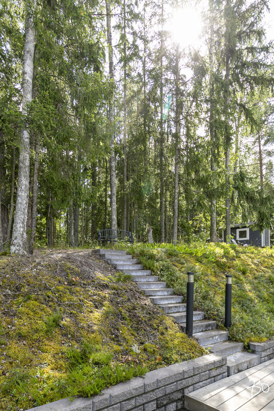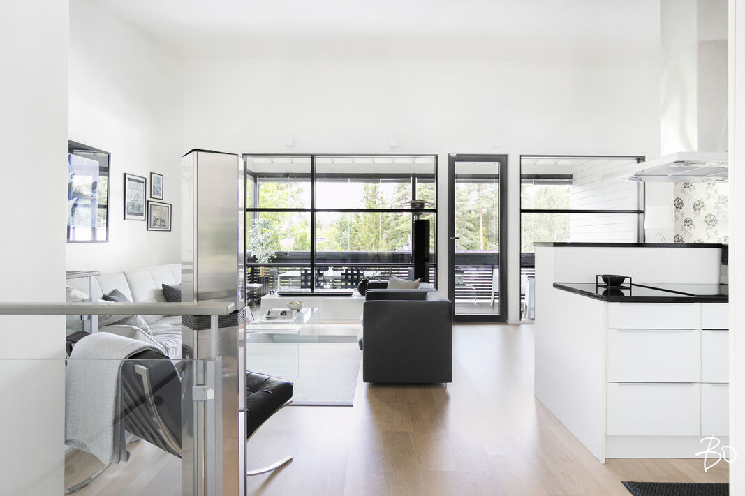 Kodin pohjaratkaisu kahdessa kerroksessa on käytännöllinen ja selkeä. Yläkerrasta löytyy yksi makuuhuone, josta avautuu kaunis näkymä viihtyisälle takapihalle ja metsään. Vieressä on tilava wc, jossa on myös suihku. Olohuone ja moderni avokeittiö muodostavat avaran kokonaisuuden, jonka kruunaa lasitettu, koko huoneiston levyinen terassiparveke. 20 m² parvekkeella kelpaa nauttia ilta-auringosta ja vehreistä maisemista.