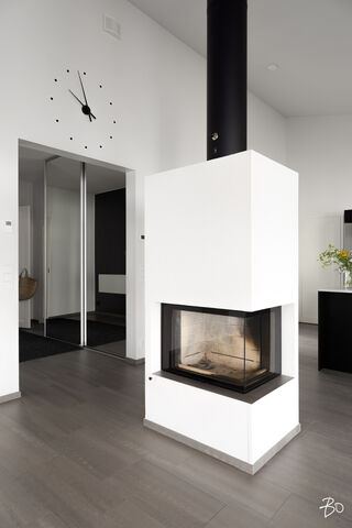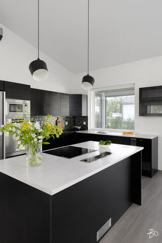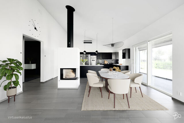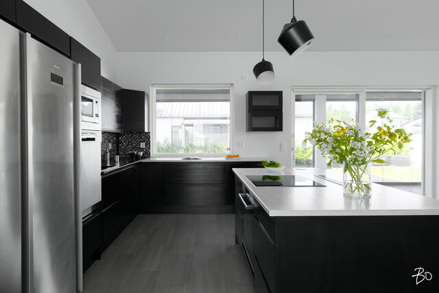 Kodin sydämessä on avara oleskelualue, jossa korkea huonekorkeus ja suuret ikkunat tulvivat valoa sisään ja luovat ilmavan, ylellisen tunnelman. Tyylikäs, hyvin varusteltu keittiö saarekkeineen yhdistyy luontevasti ruokailutilaan ja olohuoneeseen ja keskeisellä paikalla sijaitseva kiertoilmatakka tuo lämpöä sekä rauhallisia iltoja kutsuvaa tunnelmaa.