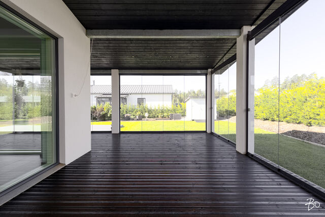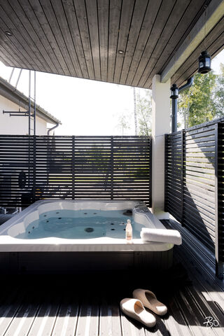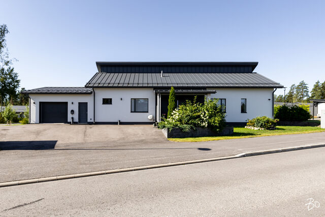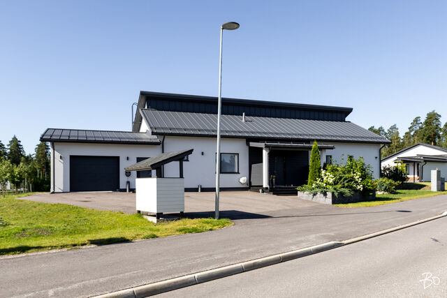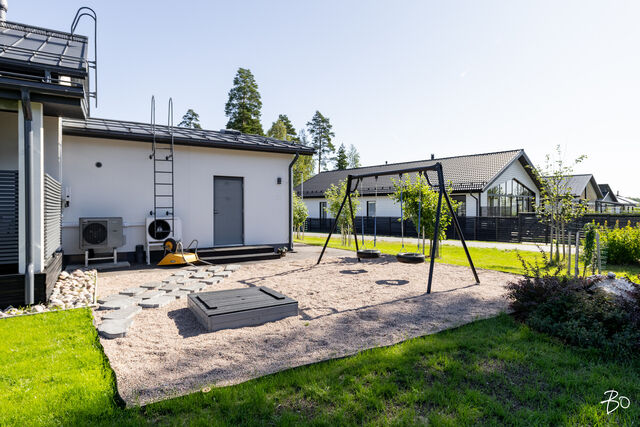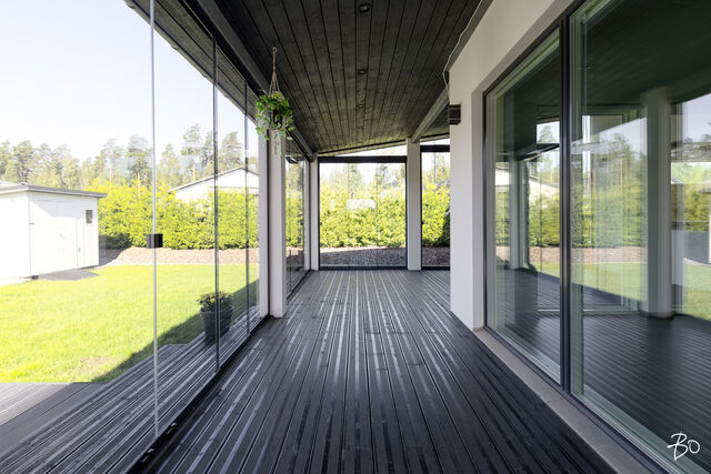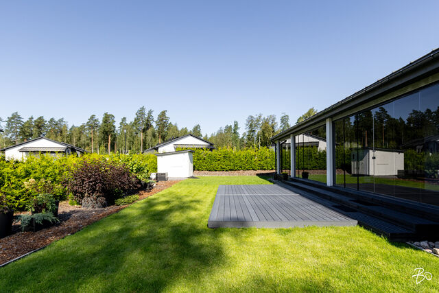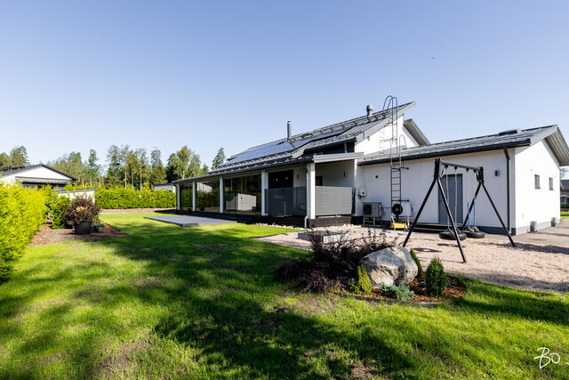 Talon yhteydessä on lämmin, hyvin varusteltu autotalli sekä varasto, jotka tarjoavat runsaasti säilytys- ja harrastustilaa. 991 m²:n oma tontti on viimeistelty huolella: etupiha on asfaltoitu ja suojaisalla takapihalla on tilaa nurmialueille, istutuksille ja oleskelulle. Lasitettu, katettu terassi poreammeineen jatkaa kodin oleskelutiloja ja tarjoaa täydellisen paikan rentoutua säästä riippumatta - lämmin vesi ja näkösuoja tekevät siitä oman yksityisen keitaan.