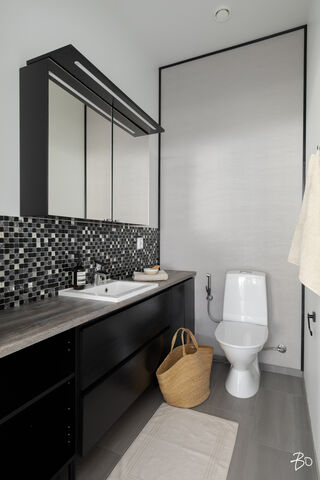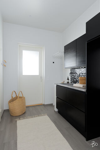 Varustus: pesukoneliitäntä, pesuallas, lattiakaivo, pyykkikaapit, kurapiste, pöytätaso