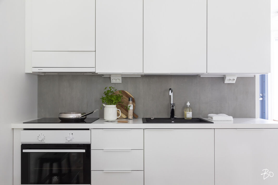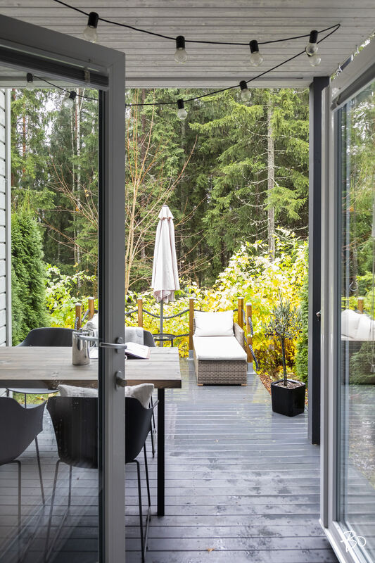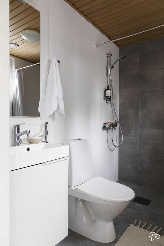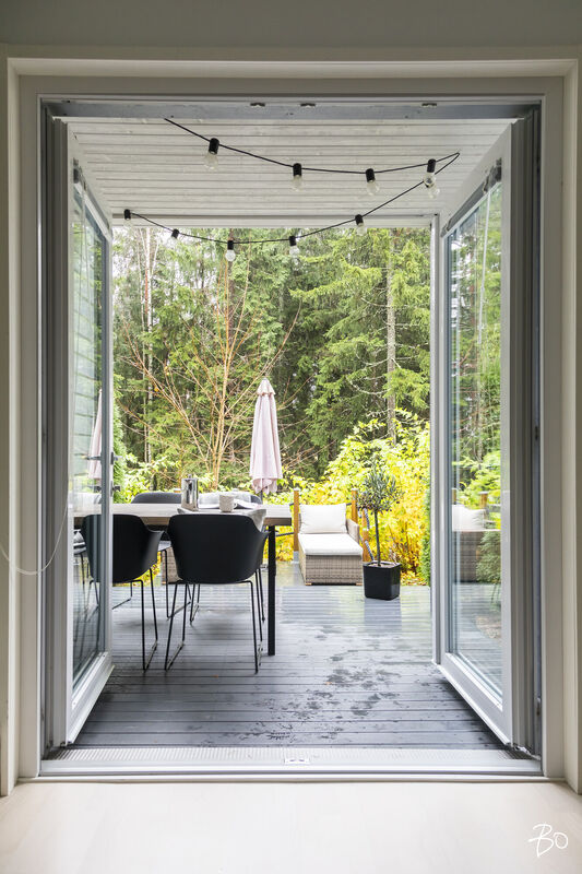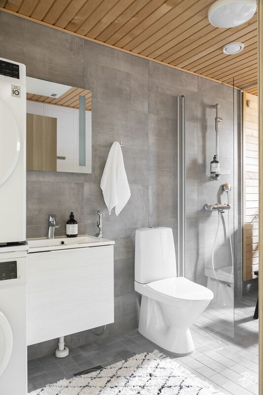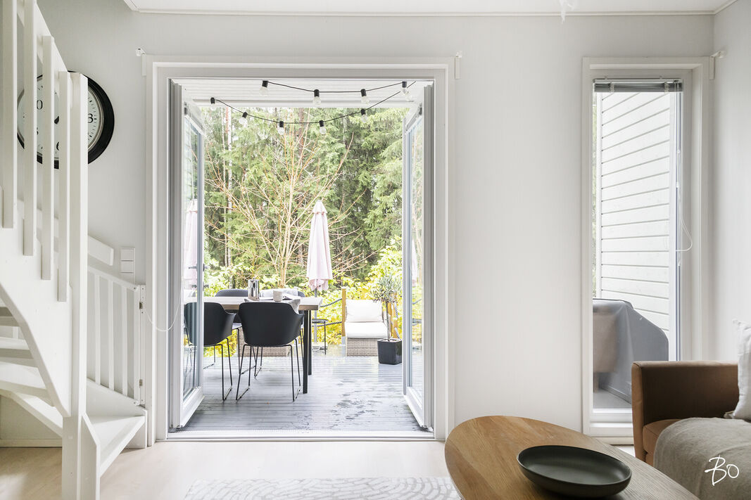 Alakerran avoin tila yhdistää olohuoneen ja modernin, hyvin varustellun keittiön, mikä luo ihanteellisen ympäristön yhdessäoloon ja arjen sujumiseksi. Vaalean harmoninen värimaailma antaa tilaa monenlaisille sisustusratkaisuille. Olohuoneen upeat lasipariovet jatkavat tilaa laajennetulle terassialueelle, joka on todella viihtyisä ja vehreyden ympäröimä keidas grillailuun ja tunnelmallisiin kesäiltoihin. Alakerran suihkullinen kylpyhuone sijaitsee käytännöllisesti heti sisääntulon yhteydessä.