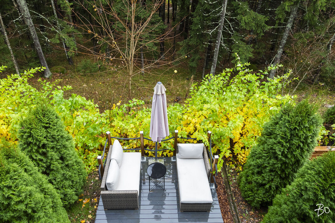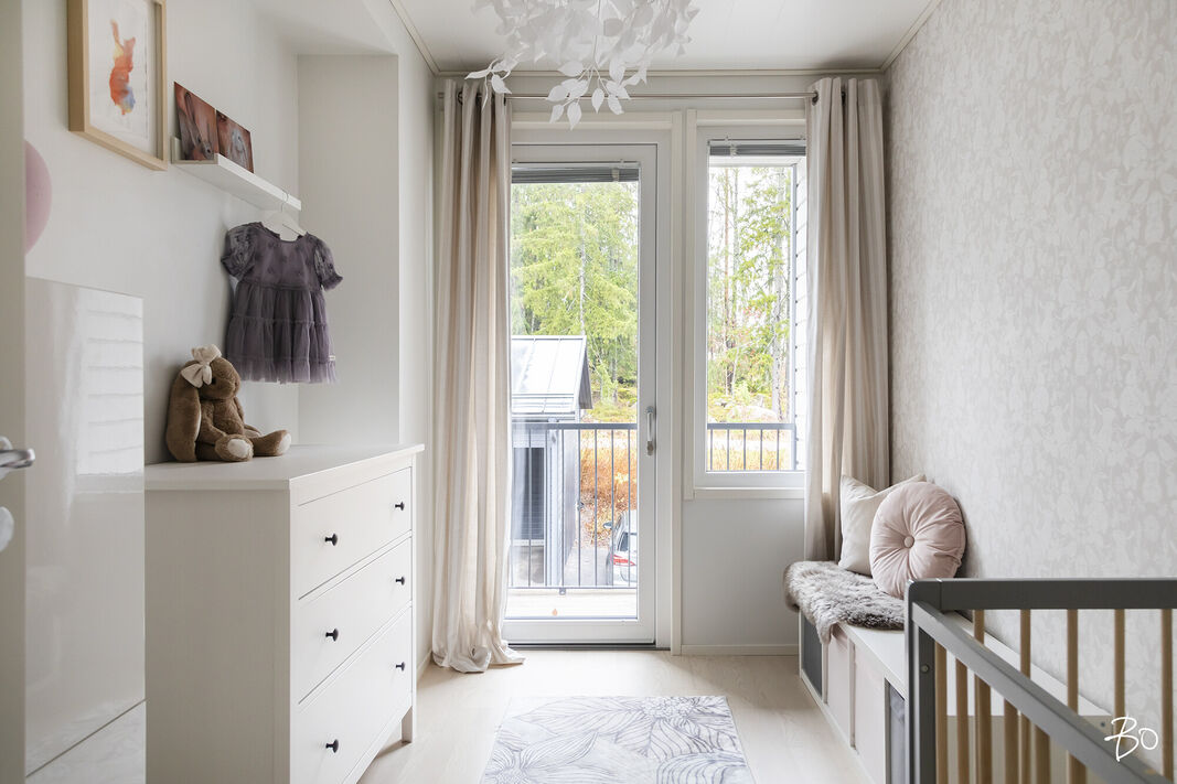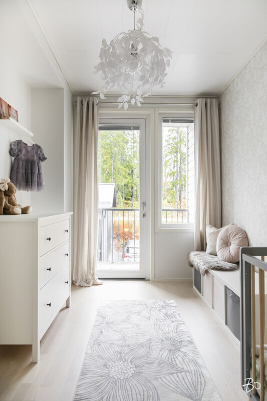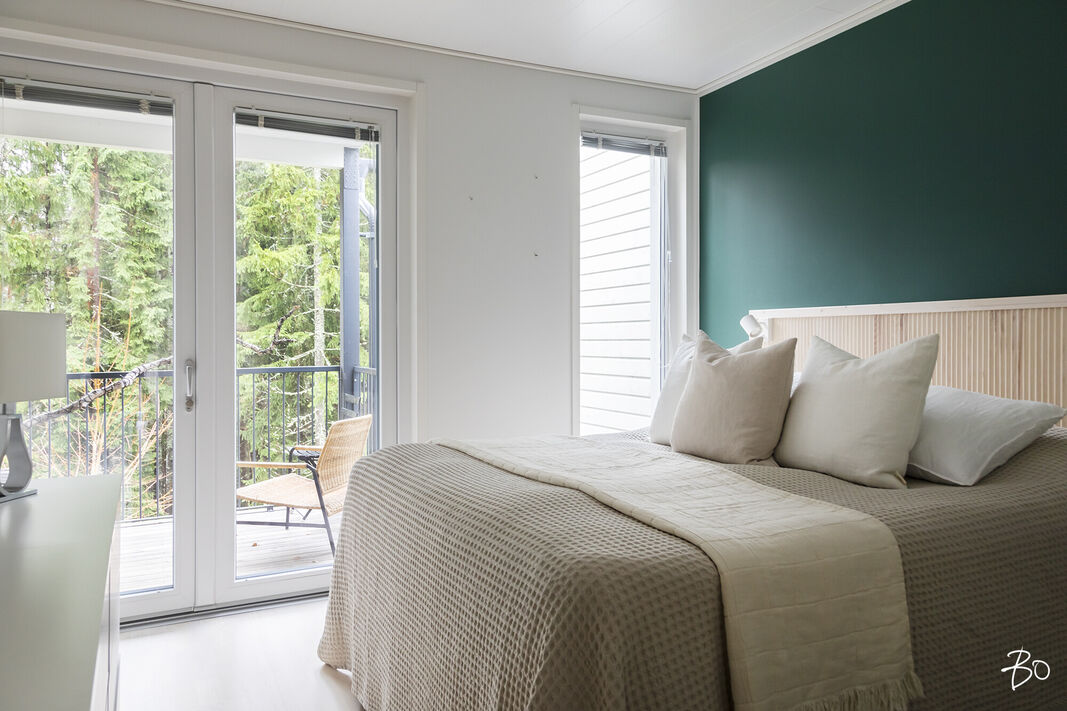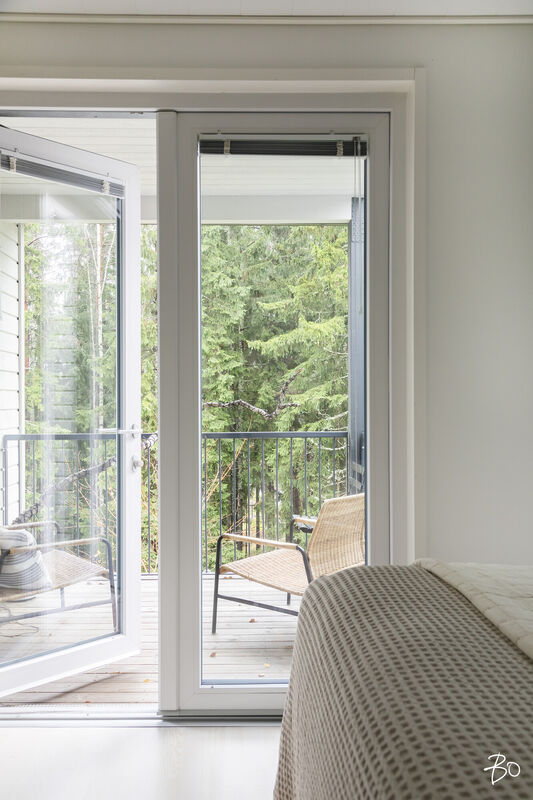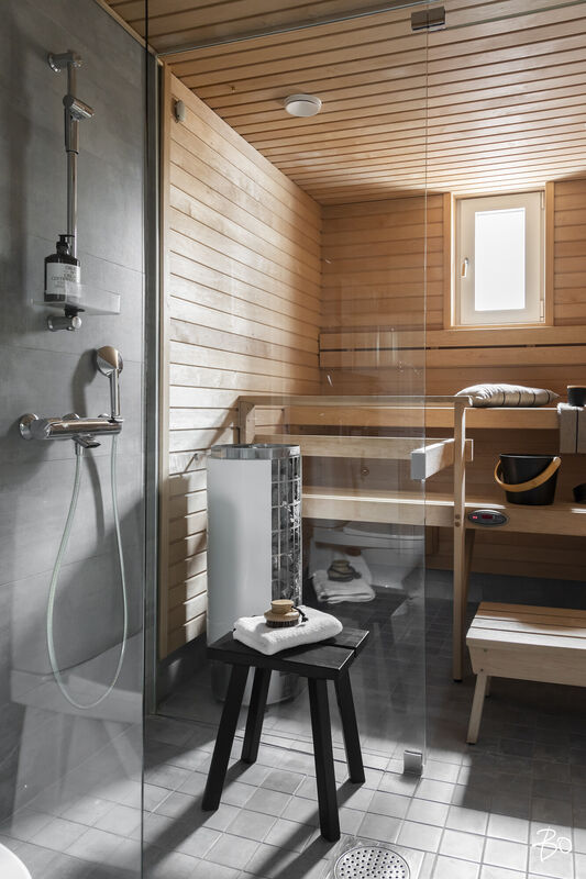 Yläkerrassa omassa rauhassaan sijaitsevat makuuhuoneet, joissa on molemmissa oma parveke. Täällä on myös tyylikäs ja tilava saunaosasto, jossa sujuu myös pyykkihuolto.