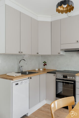keittiöön uudet tasot ja keittiötä levennettiin sen verran että saatiin tiskikone