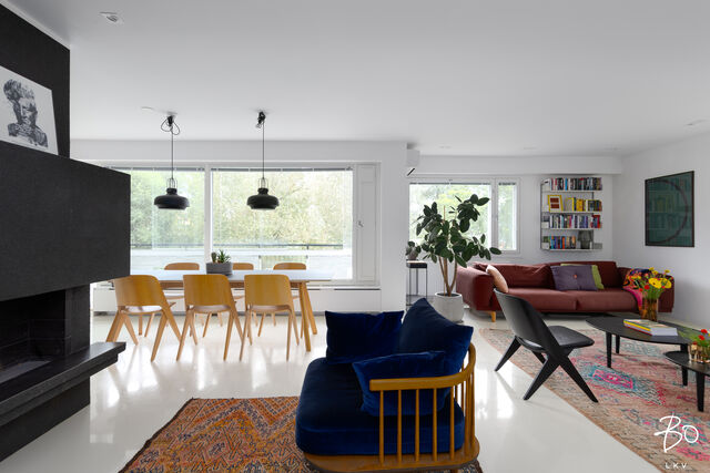 Erinomaisen pohjaratkaisun ansiosta asunto soveltuu monenlaisiin käyttötarpeisiin. Olohuone ja keittiö muodostavat avoimen tilan, jonka keskipisteenä on upea aitokivimassapintainen takka. Takka toimii tilanjakajana keittiön ja olohuoneen välillä, ja ruokailutila erottuu omaksi alueekseen keittiösaarekkeella. Keittiössä on tyylikkäät Kitzenin design -kaapistot ja integroidut kodinkoneet. Suuret ikkunat avautuvat kahteen ilmansuuntaan, ja luonnonvalon täyttämä tila on raikkaan ja avaran tuntuinen. Puhtaat linjat ja tyylikäs valkoinen lattia lisäävät tilantuntua.