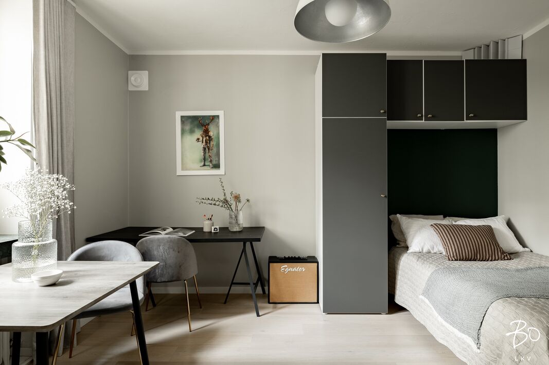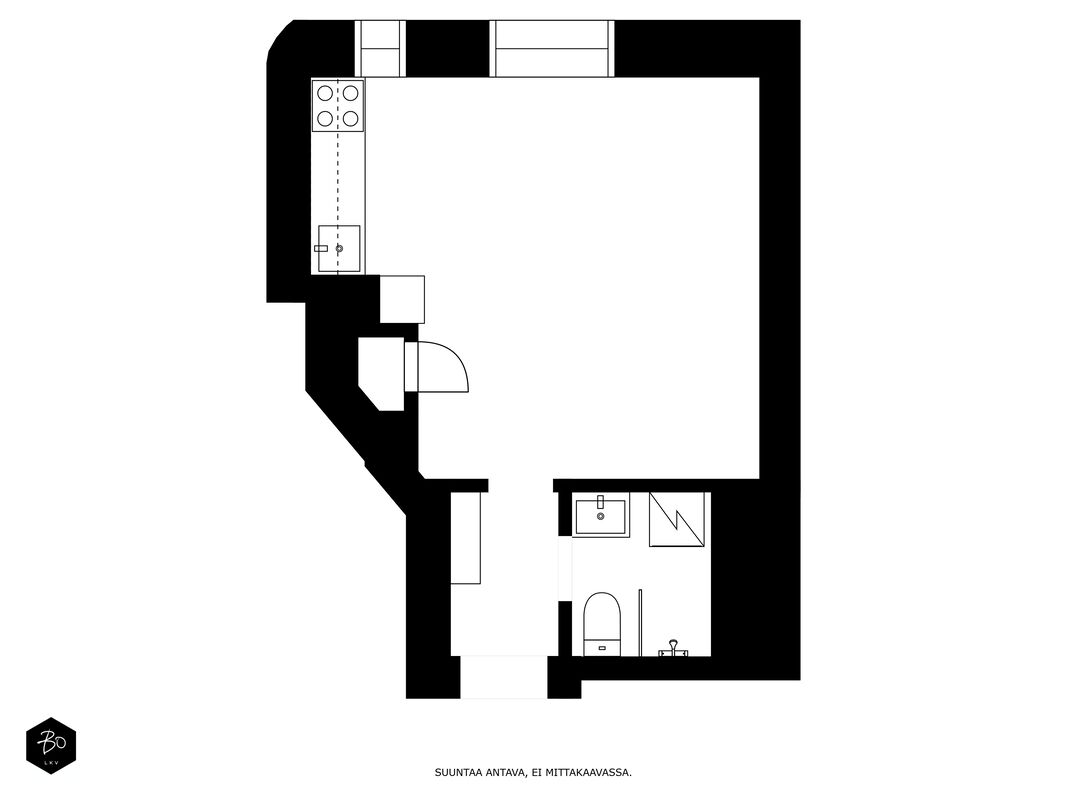 Asunnossa on tehokas pohja: tilava olohuone tuo asuntoon tilan tuntua ja antaa mahdollisuuksia moneen. Avokeittiö on tyylikkään toimiva. Kylpyhuoneeseen on käynti eteisestä ja se onkin asunnon neliöihin nähden tilava. Osakkeenomistaja voi käyttää huoneistoa yhtiöjärjestyksen mukaan myös toimistohuoneistona.