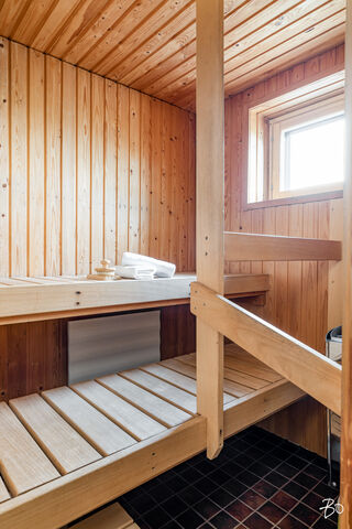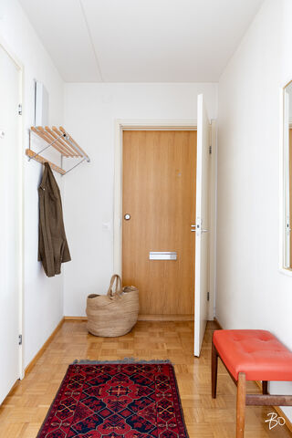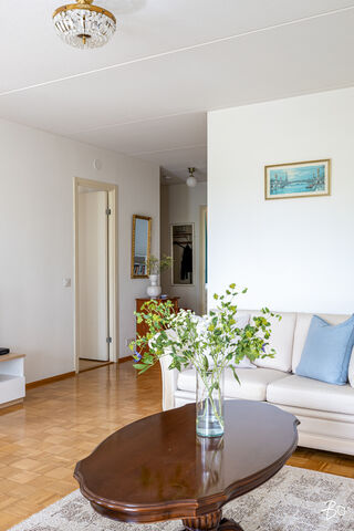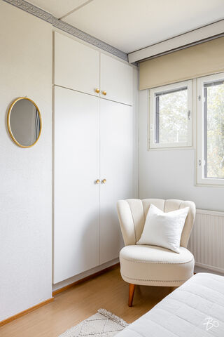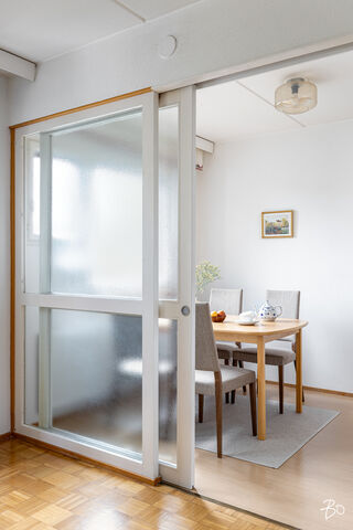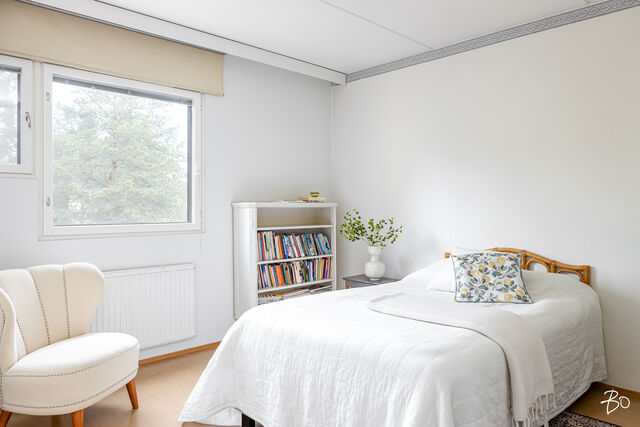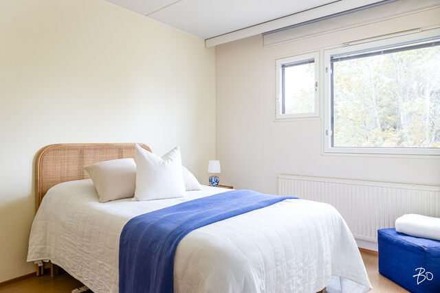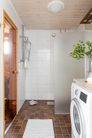 Makuuhuoneet ovat vierekkäin. Pohjoiseen suuntautuvien ikkunoiden ansiosta kesän kuumuus vähenee ja uni on taattu. Hyvin suunnitellussa pohjaratkaisussa iso olohuone yhdistyy ruokailutilan kautta vaaleaan keittiöön. Tila on myös mahdollista jakaa olohuoneen ja ruokailutilan välissä olevilla lasisilla liukuovilla. Ne vangitsevat katseen kauneudellaan ja tuovat omanlaista charmia. Vuonna 2011 remontoidussa kylpyhuoneessa on tyylikäs värimaailma. Valkoisen kontrastina on tumma laatta ja kiintokalusteet. Tilaa riittää hyvin pesutornille ja pyykkihuollolle. Ja mikä ihaninta: Oman saunan löylyistä pääset nauttimaan silloin kun itsestä parhaimmalta tuntuu.