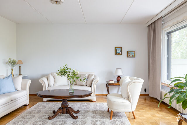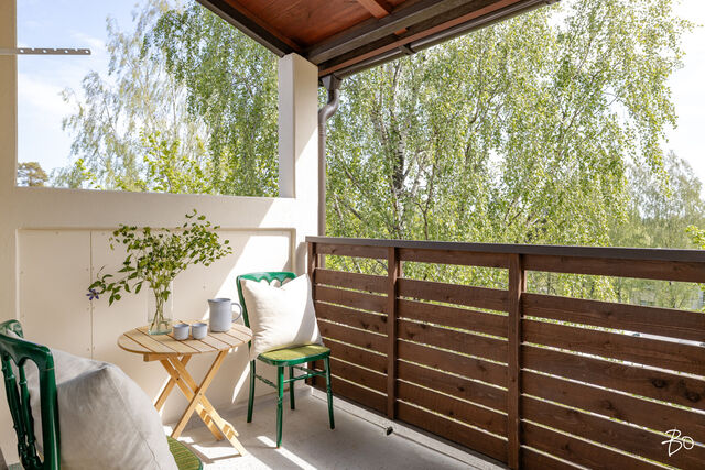 Erityisen tilava ja hyvin valoisa koti. Asunnon molemmin puolin olevista ikkunoista kuvastuu raikkaan vehreät maisemat. Kaunis puusto rauhoittaa mielen ja tuo näkösuojaa.
