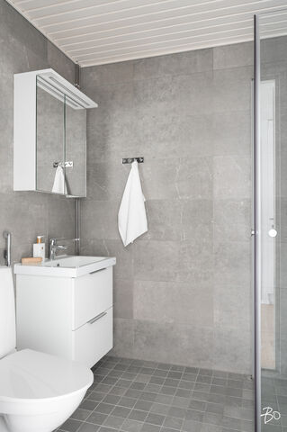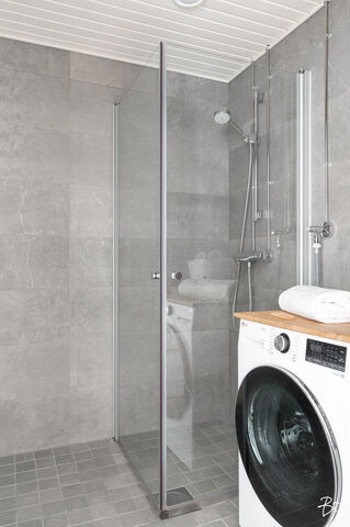 Kylpyhuoneen laatoitus perustasoa laadukkaampi, kylpyhuoneen katto on valkovahattua haapaa.
