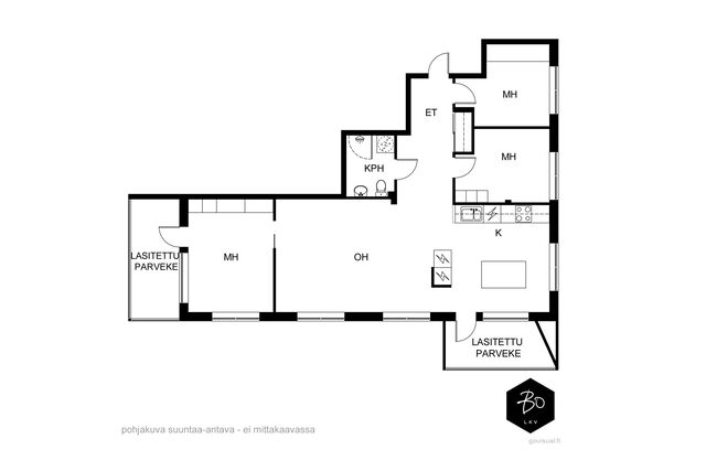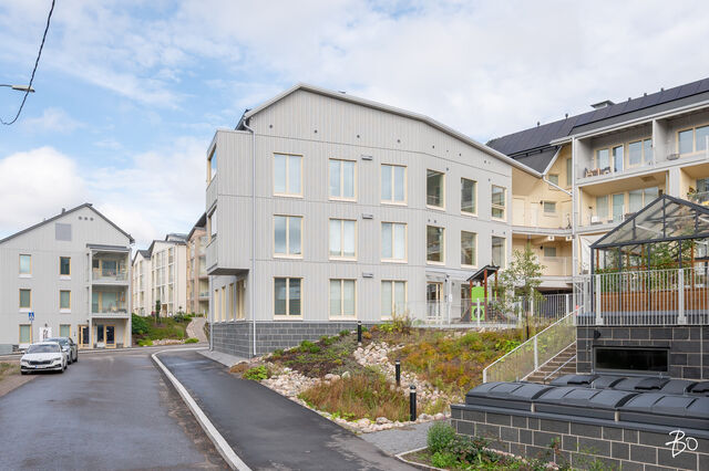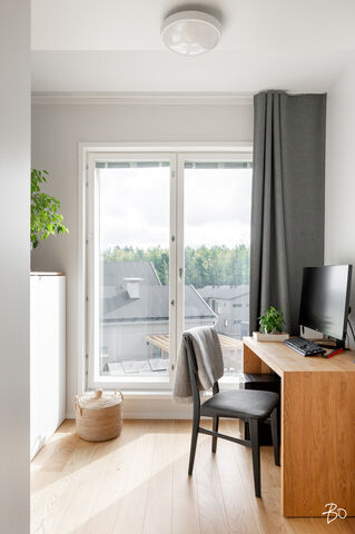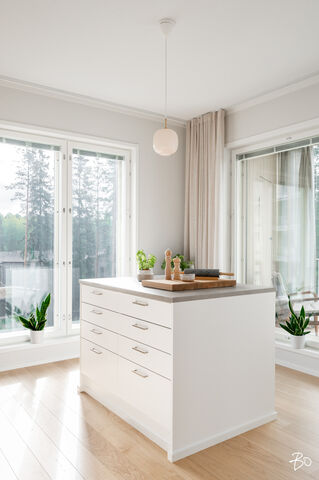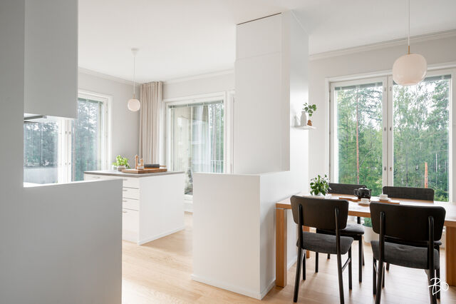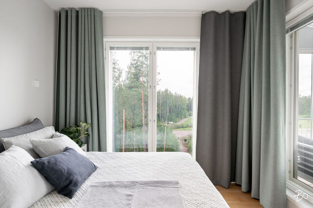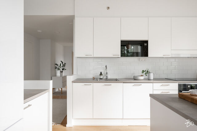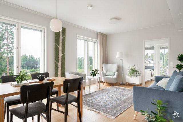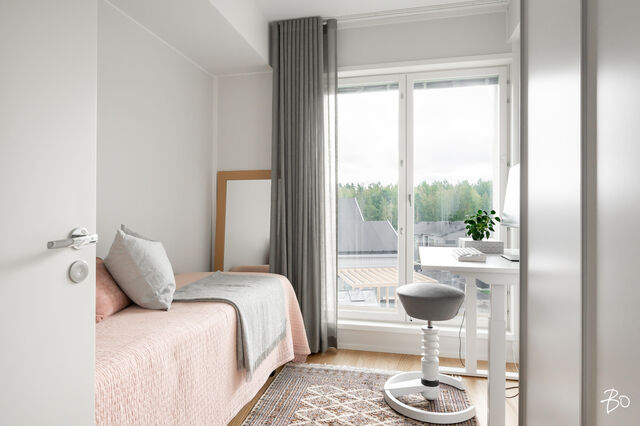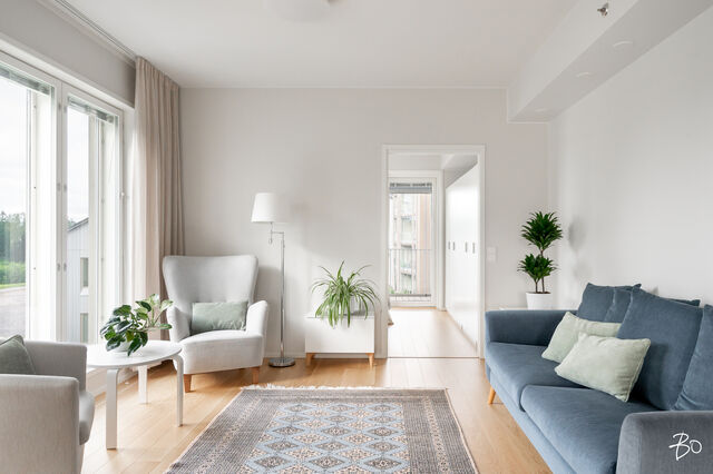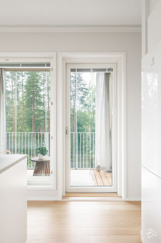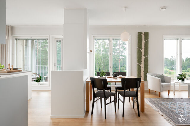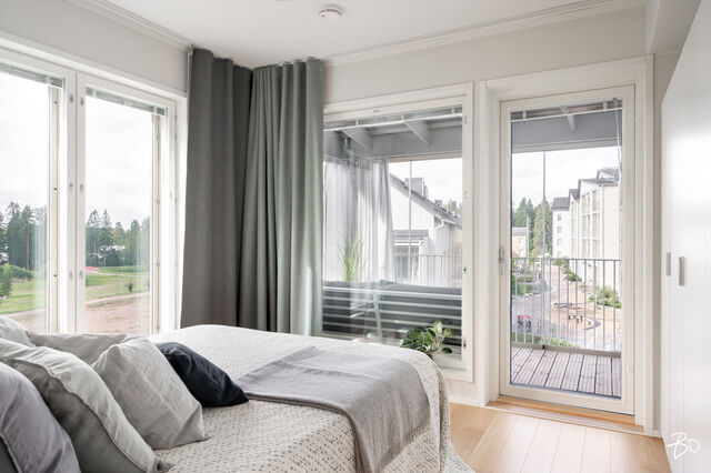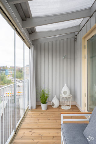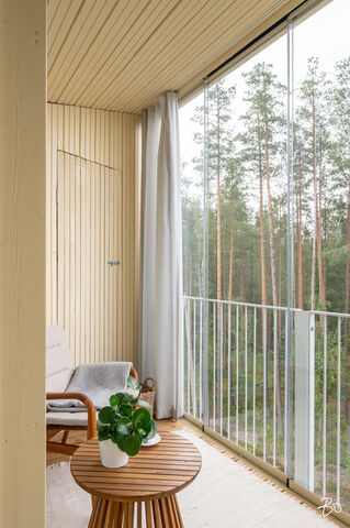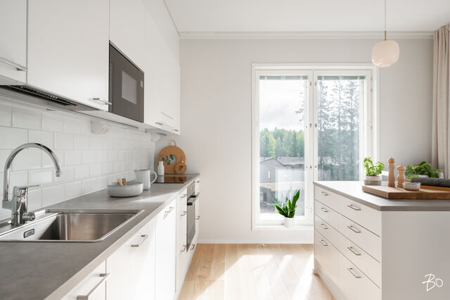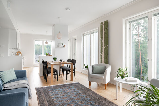 Vaaleassa avokeittiössä on integroidut kodinkoneet ja reilusti säilytystilaa sekä saareke, jota voit täydentää baarijakkaroilla, jolloin se toimii myös ruokailuun soveltuvana paikkana. Aamukahvit nautit keittiön yhteydessä olevalla lasitetulla eteläparvekkeella, josta avautuu kauniit näkymät ympäröivään luontoon. Keittiötila jatkuu valoisaan ja avaraan olohuoneeseen, joka tarjoaa erinomaiset puitteet yhdessäoloon ja rentoutumiseen. Huoneiston kaikki kolme makuuhuonetta ovat hyvänkokoisia, ja päämakuuhuoneen jatkeena sijaitsee lisäksi tilava lasitettu länsiparveke. Tunnelmallisessa ja tyylikkäässä kylpyhuoneessa on keraamiset seinälaatat ja valkovahattu paneelikatto, joka luo tilaan avaruutta ja valoisuutta.