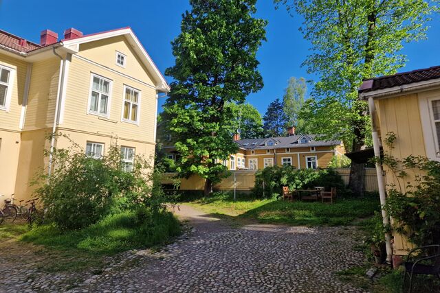 Yhtiön pihapiiri henkii rauhaa ja vehreyttä, kuten pieni oma maailma keskellä kaupunkia. Kahden kerroksen korkeudessa sijaitseva koti tarjoaa sopivasti yksityisyyttä, mutta olet silti osa yhteisöä, jossa vanhan puutalon henki elää.