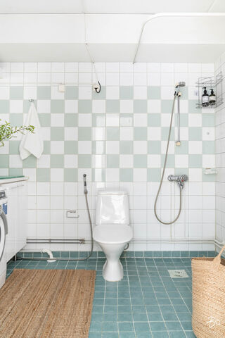 Seinät kaakeloitu, lattia laatoitettu