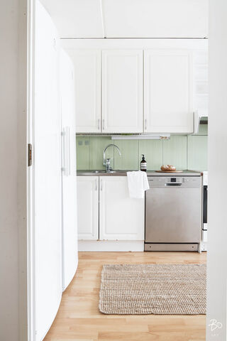 Varustus: keraaminen liesi, uuni, liesituuletin, astianpesukone, täyskorkeat jääkaappi ja pakastin. Työtasot: laminaatti. Seinät maalattu, lattia laminaatti