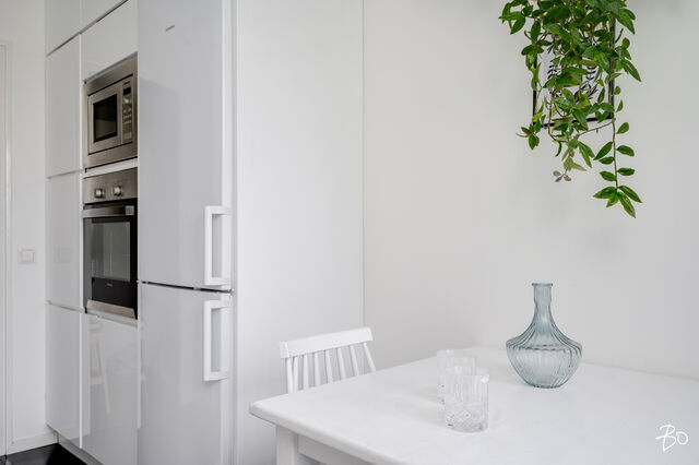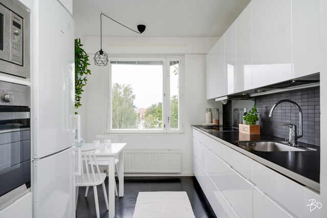 Sisään astuessa eteisen oikealle puolelle jää keittiö, jonka ikkunan alla on myös paikka pienemmälle ruokapöydälle. Keittiön ikkunasta avautuu näkymät avaralle ja rauhalliselle sisäpihalle.