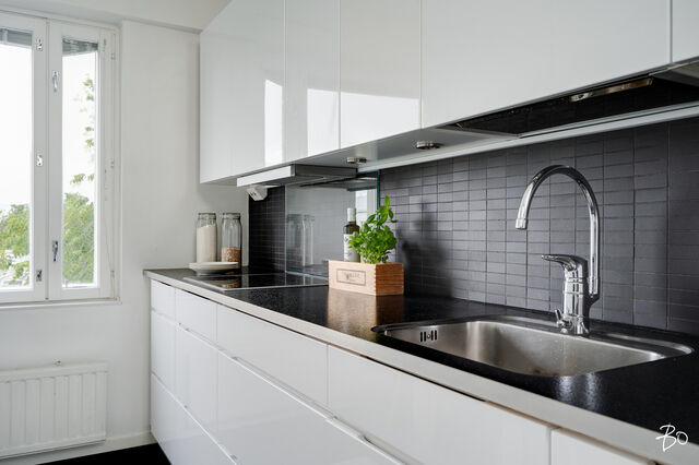 Varustus: Jääkaappi/pakastin, integroitu astianpesukone, keraaminen liesitaso, erillisuuni, kalustemikro, liesituuletin. Tasot laminaattia. Taustaseinä laatoitettu ja keraamisen liesitason tausta lasia. Lattia laminaattia.
