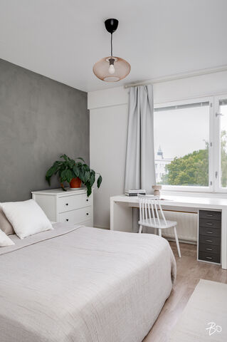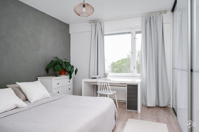 Kodin makuuhuone sijoittuu sisäpihan puolelle. Tilavaan makuuhuoneeseen mahtuu leveän parisängyn lisäksi hyvin myös esim. työpiste. Säilytystilaa löytyy koko seinän mitalta liukuovikaapistoista.