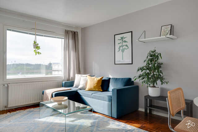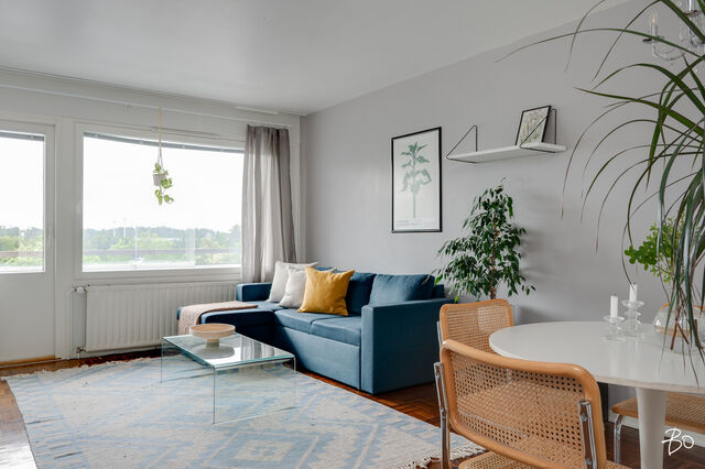 Isosta ja valoisasta olohuoneesta on ikkunat Kupittaanpuiston suuntaan. Olohuoneessa on hyvät tilat niin oleskeluun kuin ruokailuunkin. Huoneistolle kuuluu lasitettu parveke, jonne on kulku olohuoneesta. Ylimmästä kerroksesta aukeavat maisemat Kupittaanpuiston yli ovat vertaansa vailla!