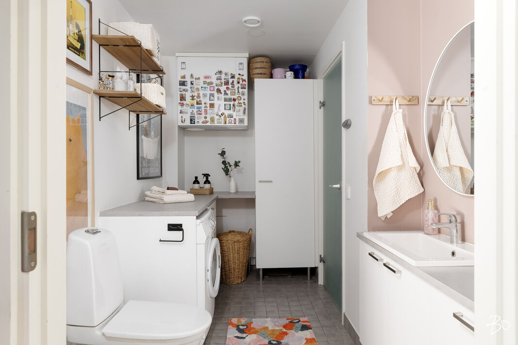 Varustus: pesukoneliitäntä, pesuallas, lattialämmitys, lattiakaivo