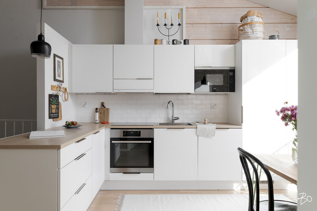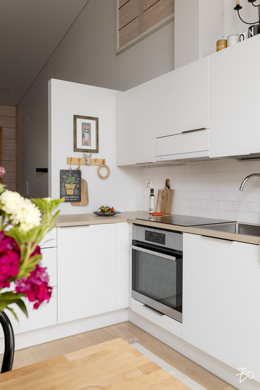 Tämä vuoden 2019 hirsipintainen rivitaloasunto on todellinen kodikkuuden esimerkki. Avarat, hyvin suunnitellut tilat käsittävät kaksi makuuhuonetta, keittiön, saunan, pesuhuoneen, erillisen wc:n ja työhuoneen, jota voi mainoisti käyttää vaikkapa makuuhuoneena. Asunnon henkeä luovat laadukkaat materiaalit ja huolella viimeistellyt yksityiskohdat, jotka korostavat yksilöllistä sisustusta. Keittiön ranskalainen parveke tuo tiloihin lisää valoa ja ilmettä.