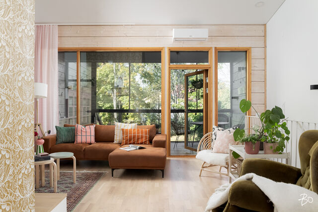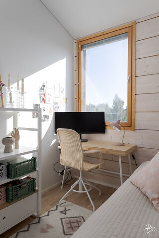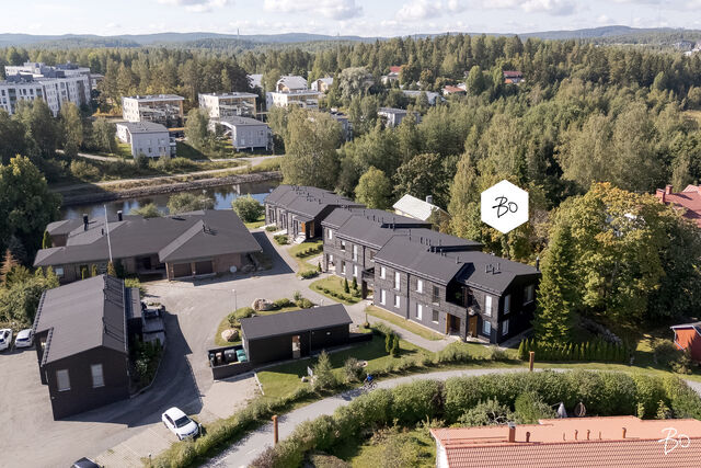 Tämä vuoden 2019 hirsipintainen rivitaloasunto on todellinen kodikkuuden esimerkki. Avarat, hyvin suunnitellut tilat käsittävät kaksi makuuhuonetta, keittiön, saunan, pesuhuoneen, erillisen wc:n ja työhuoneen, jota voi mainoisti käyttää vaikkapa makuuhuoneena. Asunnon henkeä luovat laadukkaat materiaalit ja huolella viimeistellyt yksityiskohdat, jotka korostavat yksilöllistä sisustusta. Keittiön ranskalainen parveke tuo tiloihin lisää valoa ja ilmettä.