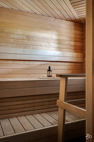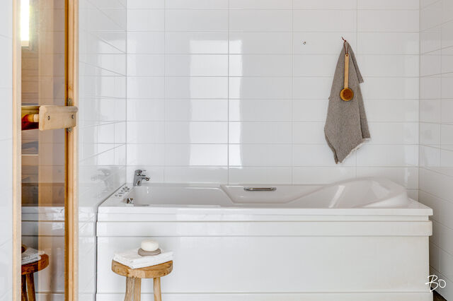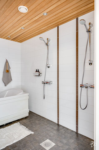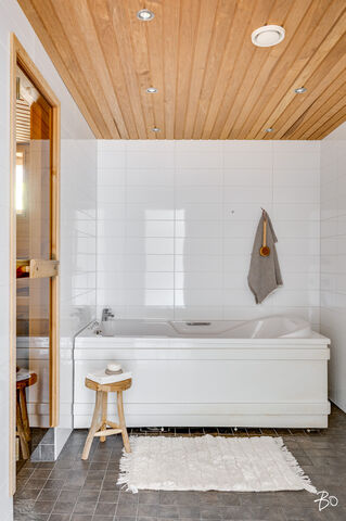 Alakerran kylpyhuoneessa on tuplasuihku, poreallas ja sauna.