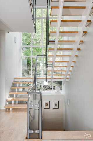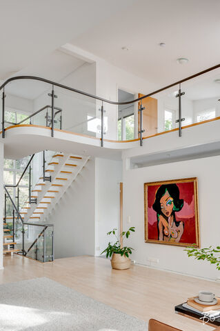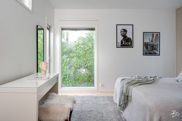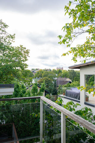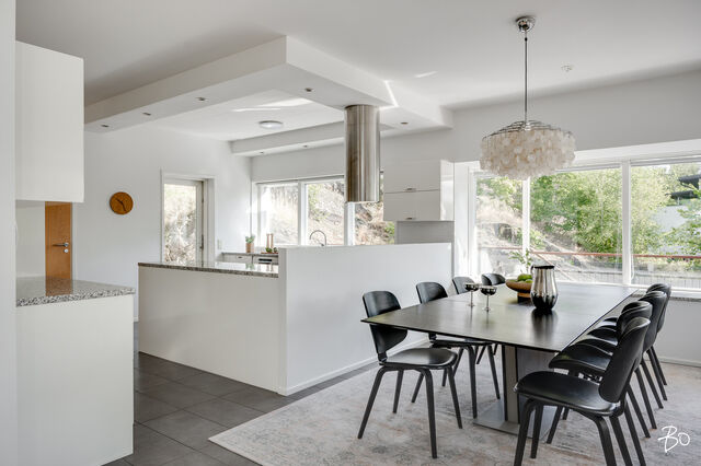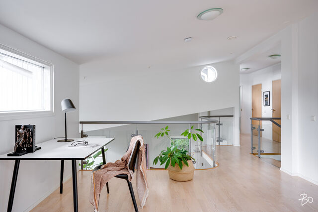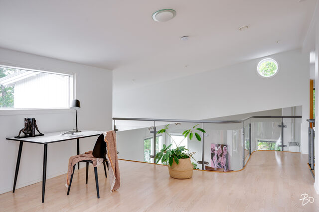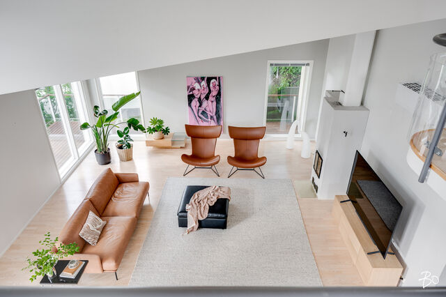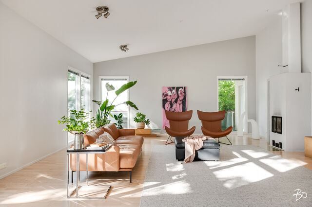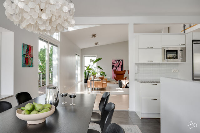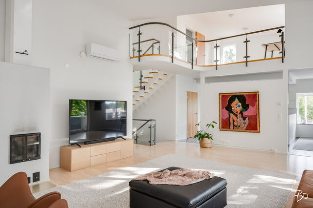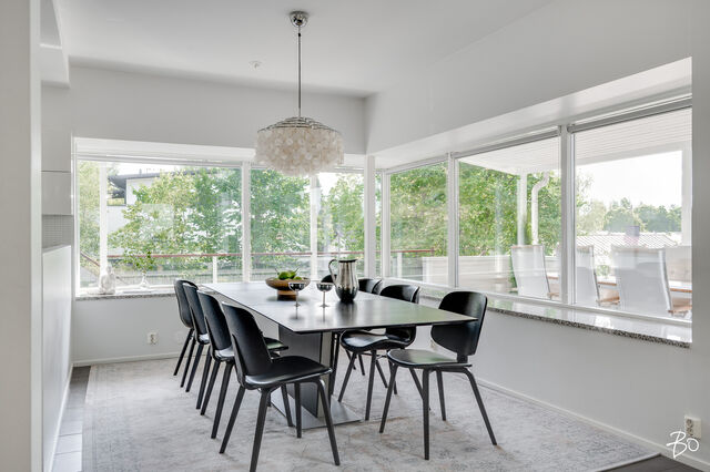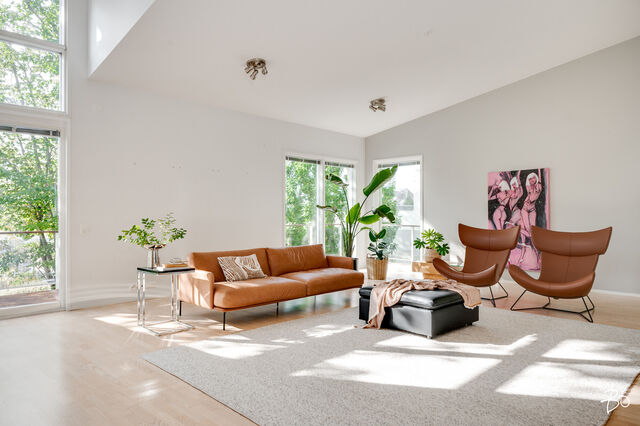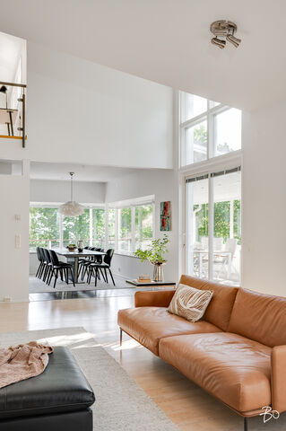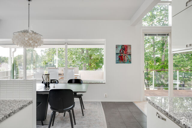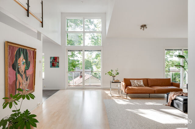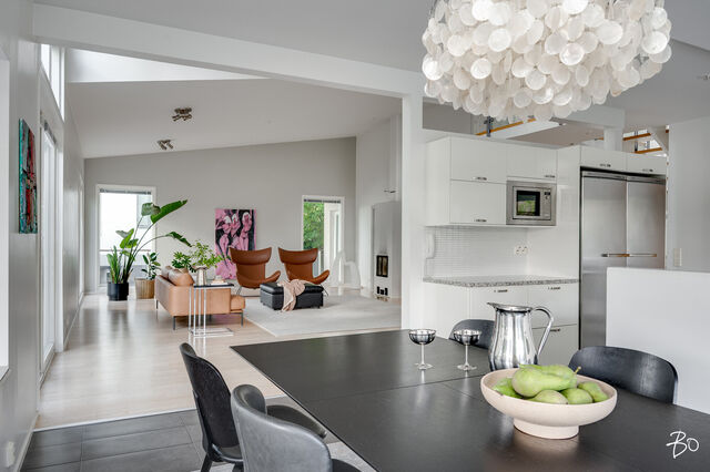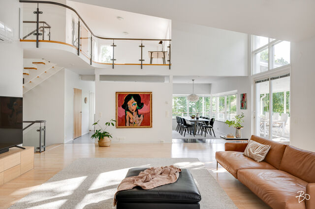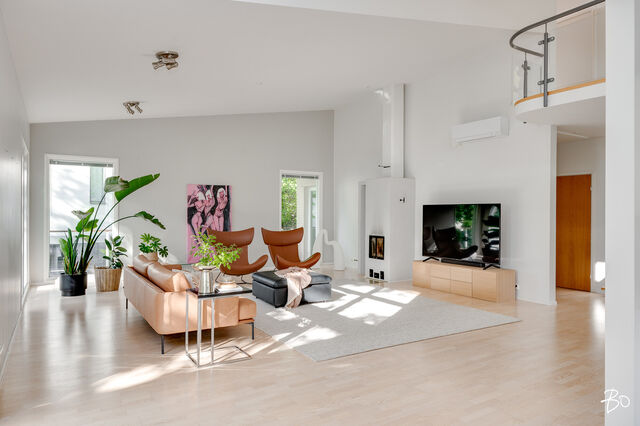 Keskikerroksessa näyttävän olohuonetilan avonainen huonekorkeus kohoaa noin viiteen metriin, ja isot ikkunapinnat avartavat huonetta entisestään. Olohuoneen yhteydestä aukeaa ovet suoraan takapihan terassille, joten kesäisin ruokailut on helppo toteuttaa myös ulos kattaen. Suuren ikkunapinta-alan ja hienojen tilaratkaisujen ansiosta pääsee koti kylpemään luonnonvalossa.