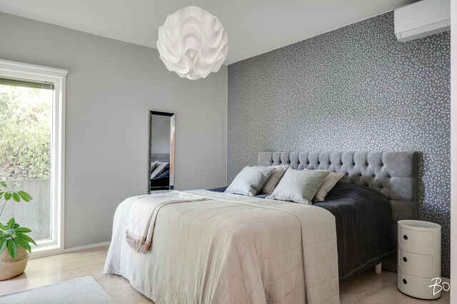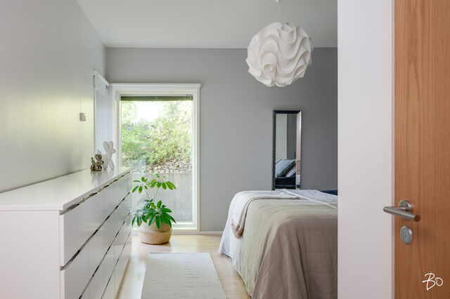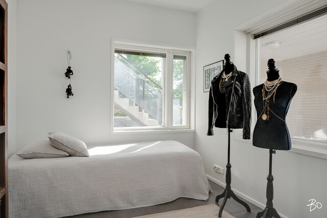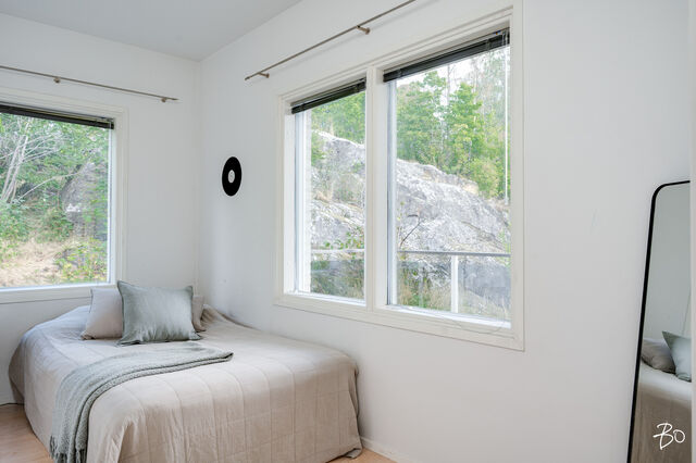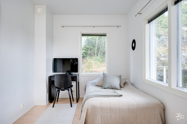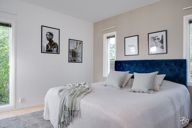 Makuuhuoneita talosta löytyy yhteensä neljä kappaletta, joista yksi alakerrasta, yksi keskikerroksesta ja kaksi yläkerrasta. Makuuhuoneiden lisäksi yläkertaan on sijoitettu kylpyhuone ja tilava aulatila oleskeluun.
