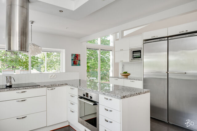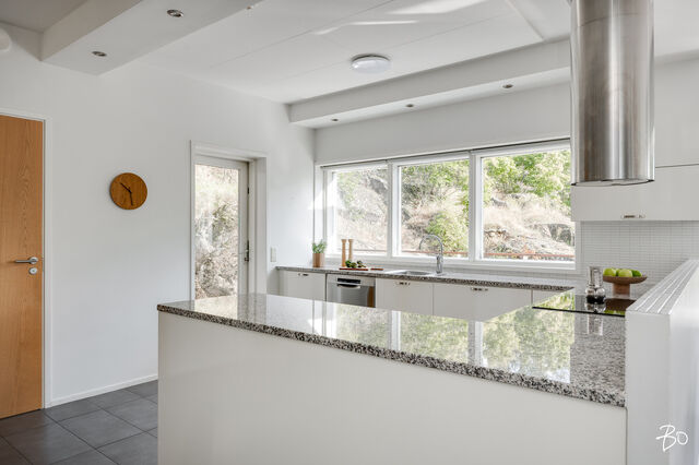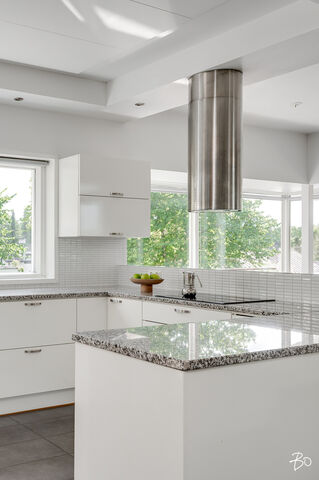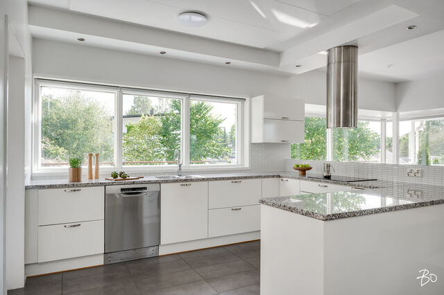 Hyvin varustellussa keittiössä kokkaat isommallekin väkijoukolle. Laadukkaat kodinkoneet ja kivitasot viimeistelevät kokonaisuuden täyttämään vaativammankin kotikokin tarpeita ja toiveita.