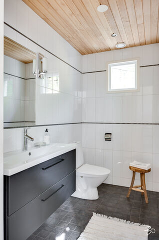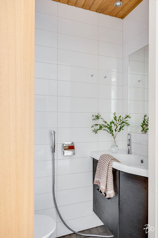 Yläkerran wc on kylpyhuoneen yhteydessä. Lattiat ja seinät laattaa. Lattialämmitys.