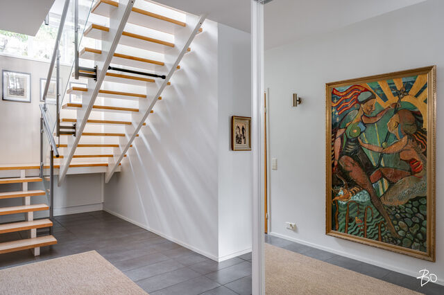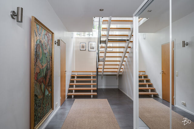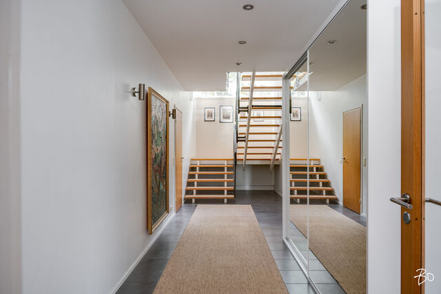 Kodin asuintilat on rakennettu kolmeen kerrokseen ja sisään johdattaa tyylikäs eteisaula. Sisääntulokerrokseen sijoittuvat kodin saunaosasto, wc sekä yksi makuuhuone, joka toimii erinomaisesti myös työhuoneena. Sisääntulokerroksessa on lisäksi ruhtinaalliset säilytystilat ja suoraan asuntoon yhdistyvä kahden auton lämmin talli.