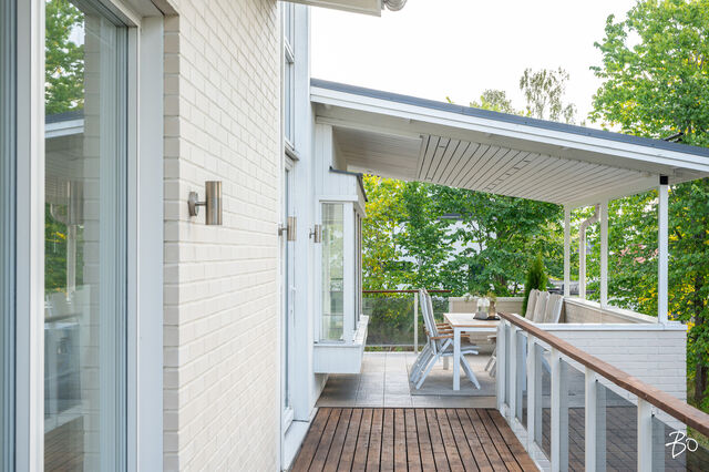 Helppohoitoinen tontti ja upeat terassit takaavat myös ulkotiloissa viihtymisen. Asfaltoitu pihamaa puolestaan nivoaa kokonaisuudesta toimivan ja tyylikkään ympäri vuoden.