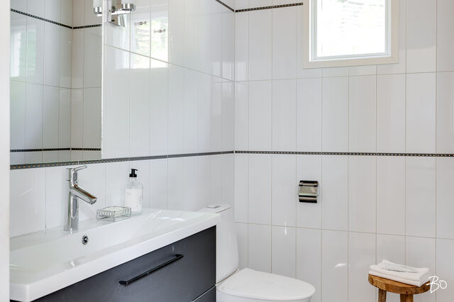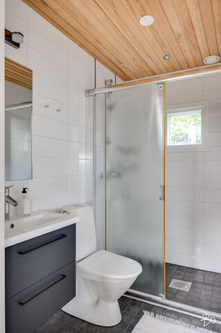 Yläkerran kylpyhuoneessa on suihku, wc, ja käsienpesuallas.