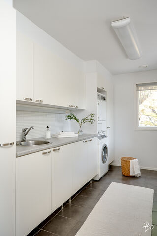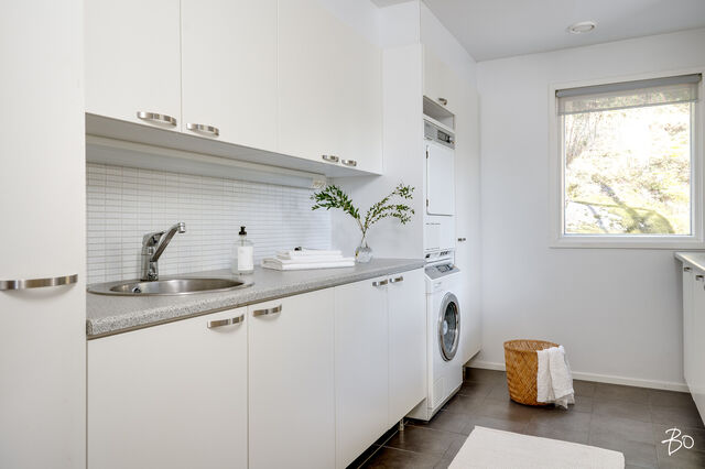 Tilava ikkunallinen kodinhoitohuone sijaitsee keittiön vieressä. Wc-tiloja on kaikissa kerroksissa, joista kaksi erillisenä ja yksi yläkerran kylpyhuoneen yhteydessä.