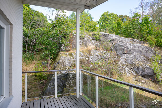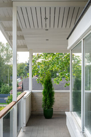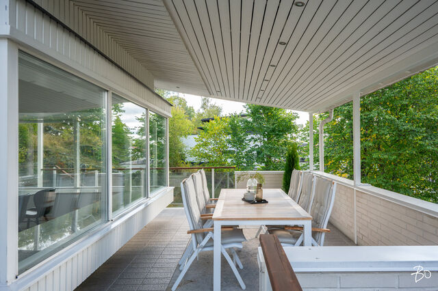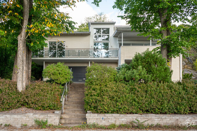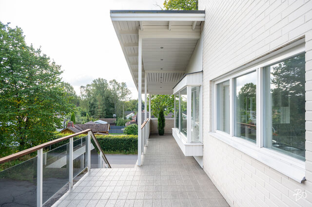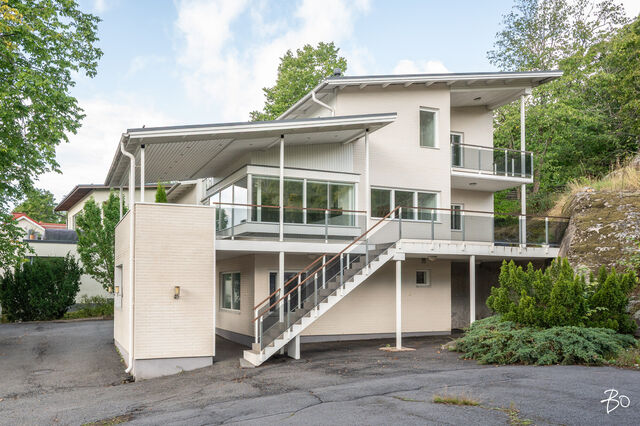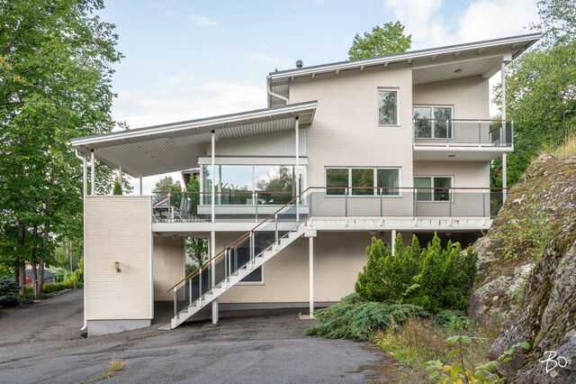 Vuonna 2006 valmistunut talo näyttäytyy ylväänä rinteen päällä. Kallioinen oma rinnetontti on huoliteltu ja viimeistelty istutuksin, mutta helppohoitoinen ja osin asfaltoitu piha ei kuitenkaan vaadi liikaa huolenpitoa kiireisen arjen keskellä. Talon pohjaratkaisussa on otettu huomioon niin aikuisten kuin lapsiperheenkin tarpeet, ja lopputuloksena onkin moni-ilmeinen, ylellinen ja erittäin toimiva kokonaisuus. Talossa on vesikiertoinen lattialämmitys, joten halutessaan lämmönlähteen voi vaihtaa, vaikka maalämpöön.