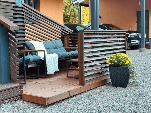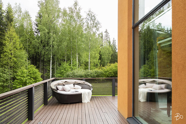 Erillinen saunarakennus kruunaa kokonaisuuden: suuri sauna, tyylikäs kylpyhuone ja tunnelmallinen takkahuone, joka toimii myös vieras- tai työtilana. Terassi yhdistää rakennukset käytännöllisesti ja kutsuvasti.