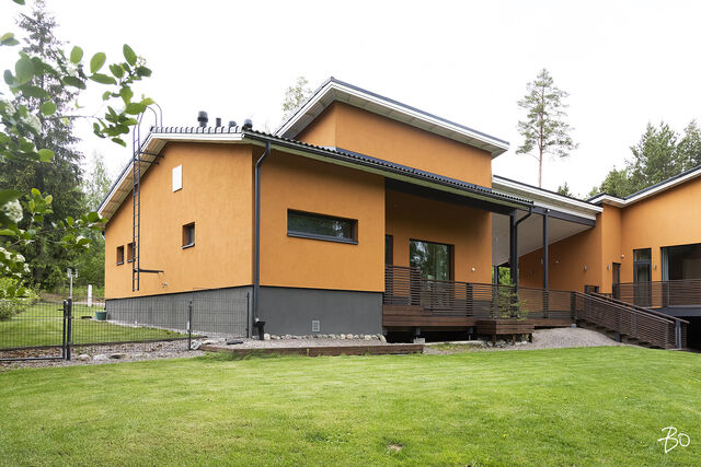 on rakennettu rinteeseen. Etupihalla on kalliomursketta ja se on helppohoitoinen.