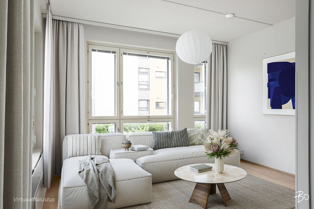 Tämä vuonna 2018 valmistunut valoisa kerrostalokoti hurmaa heti sisään astuttaessa isojen ikkunoiden ja vaaleiden sisustussävyjen ansiosta. Hyvin suunniteltu pohjaratkaisu saa asunnon tuntumaan aidosti neliöitään suuremmalta.