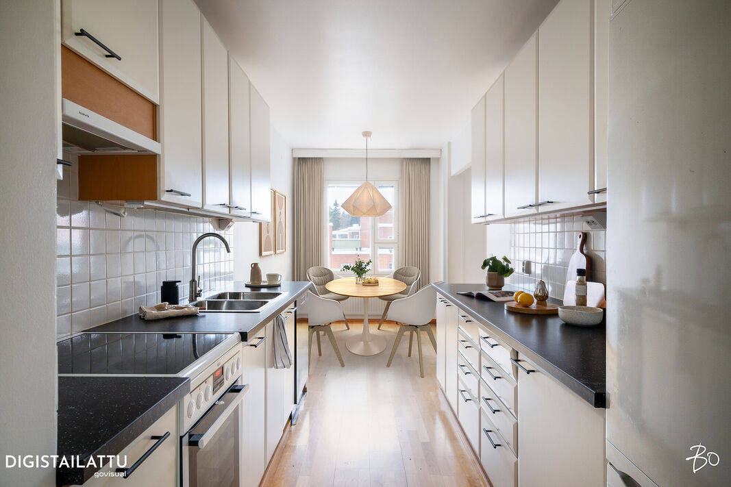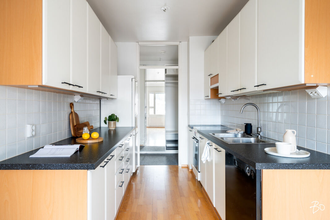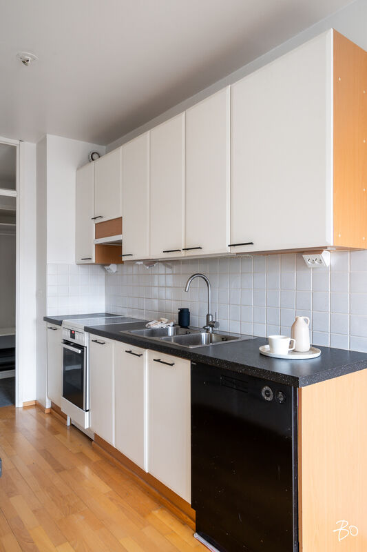 Varustus: jääkaappi/pakastin, astianpesukone, liesi, liesituuletin.