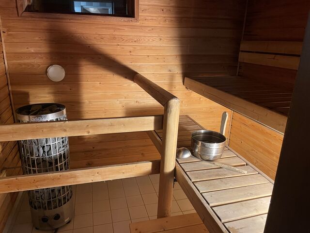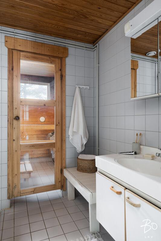 Lattia laattaa (lattialämmitys) ja seinät hirttä ja paneelia.