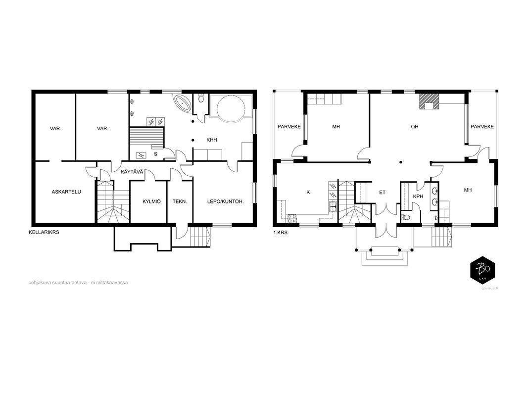 Asemapiirroksen mukaiset pinta-alat: asuinkerros 98,5 m2, kellari 80 m2.